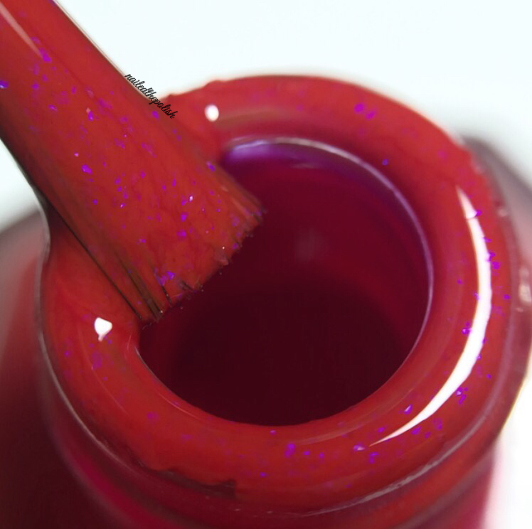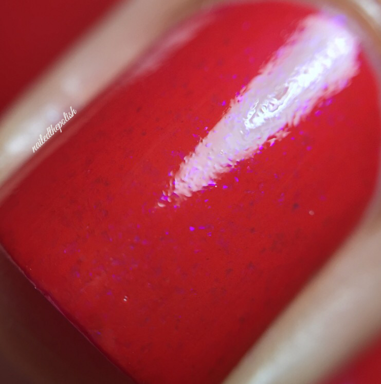 Last up is Deeply – a deep red creme with purple flakes. Shown here is one flawless coat with top coat. If you’re a fan of red and flakes – you NEED this polish. Even if you aren’t a fan, you still need it! The flakes make this polish so unique. I do not have anything like this in my collection. It was a little difficult to show the flakes in my swatch but you can definitely see them in the bottle I am holding as well as the two macro shots below.