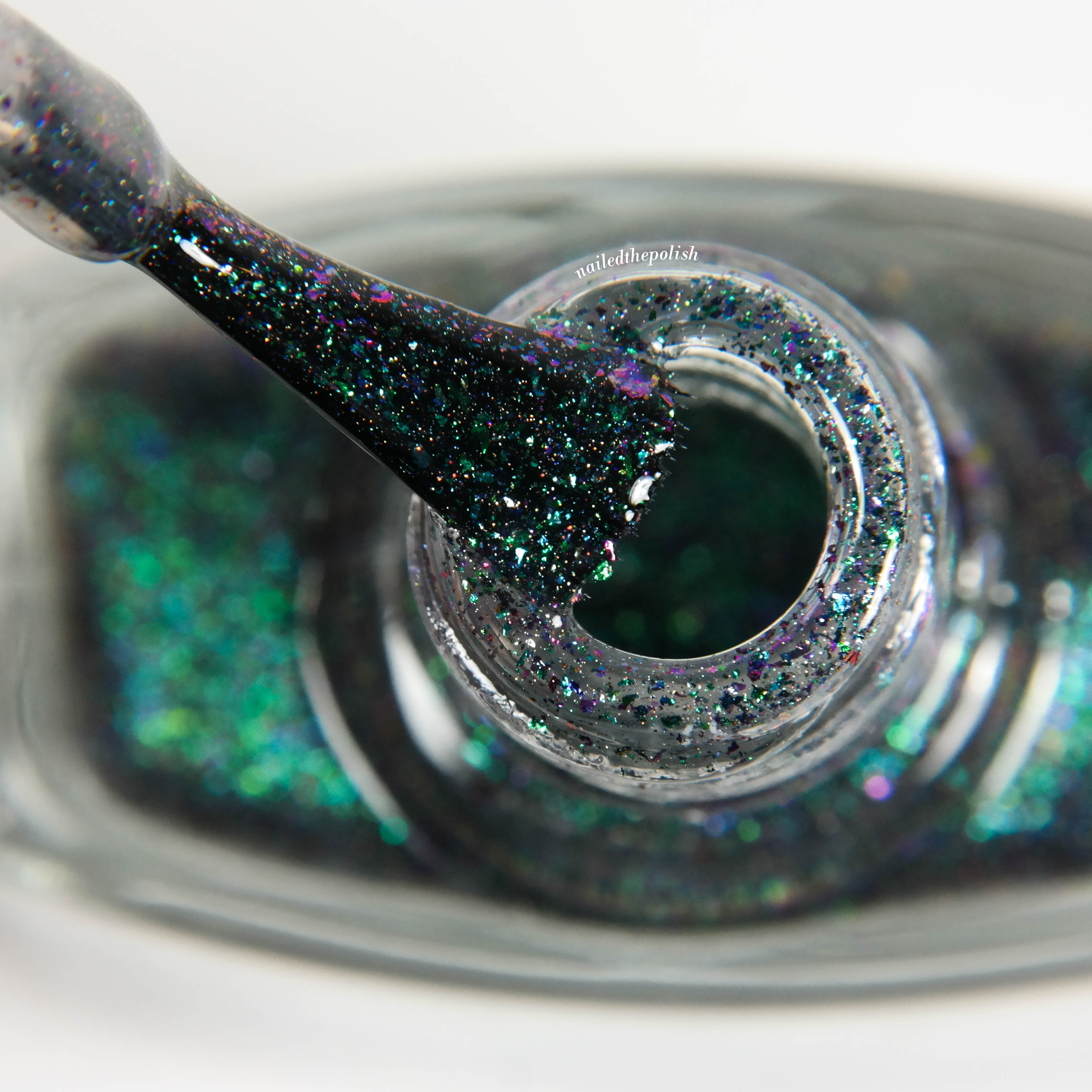 Wooster St. is a mini ultra chrome flakie polish that shifts from green to blue to purple with hints of holo throughout. Here I have ONE coat over Muse with top coat. This polish melts my heart. I love everything about it – the size of the flakies, the color shift, the added holo, the smooth application. LOVE!