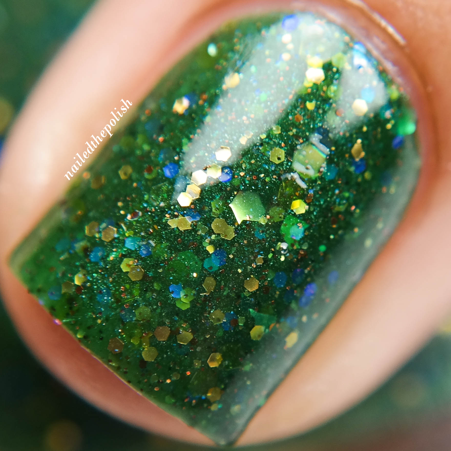 Catching Fire Flies is a forest green jelly polish that is filled with metallic royal blue, green, and gold glitters in various sizes with added micro metallic glitters. Two coats with top coat. Just like Iris Fields, I could not be happier with the formula considering how much glitter there is! I love how fitting the name is for this polish.