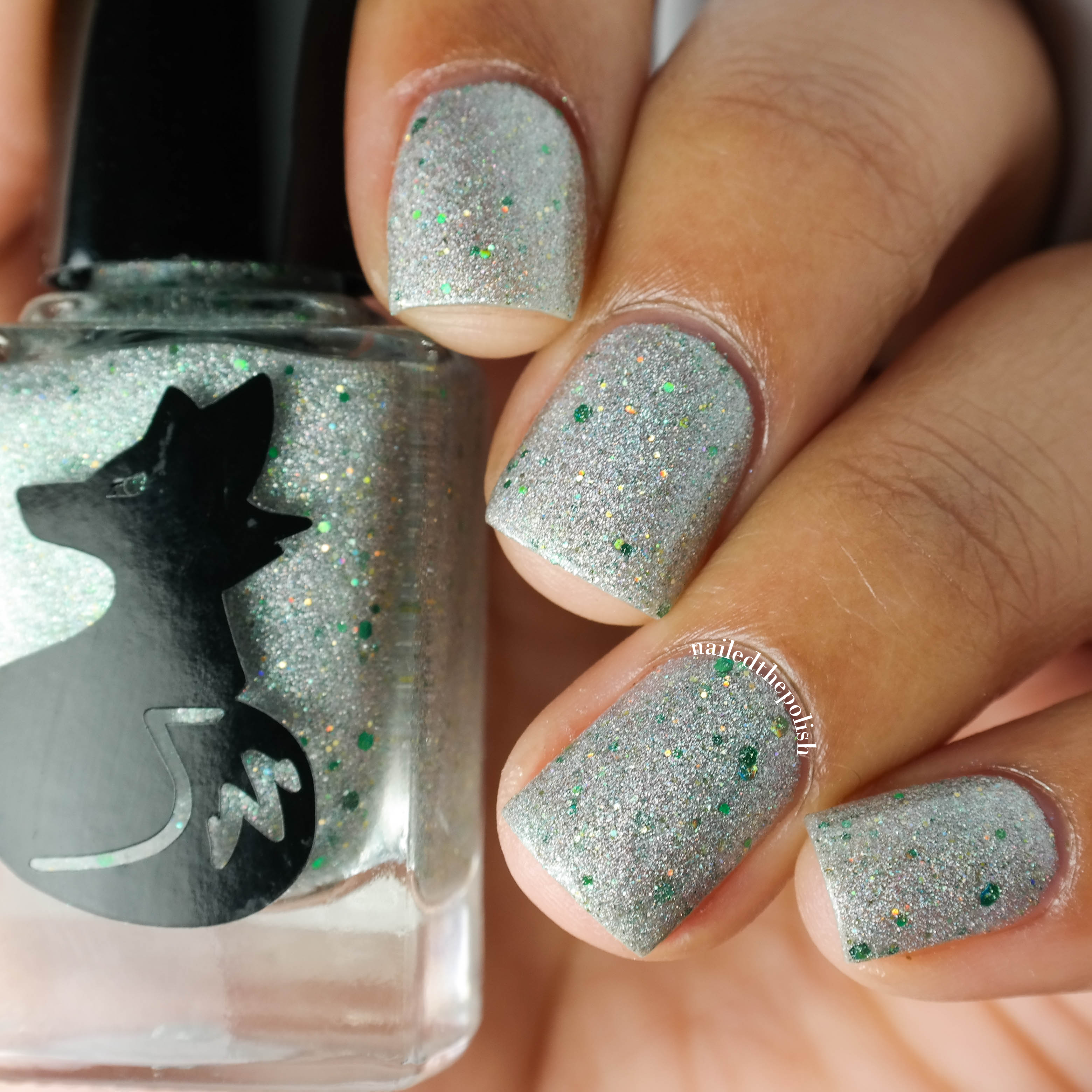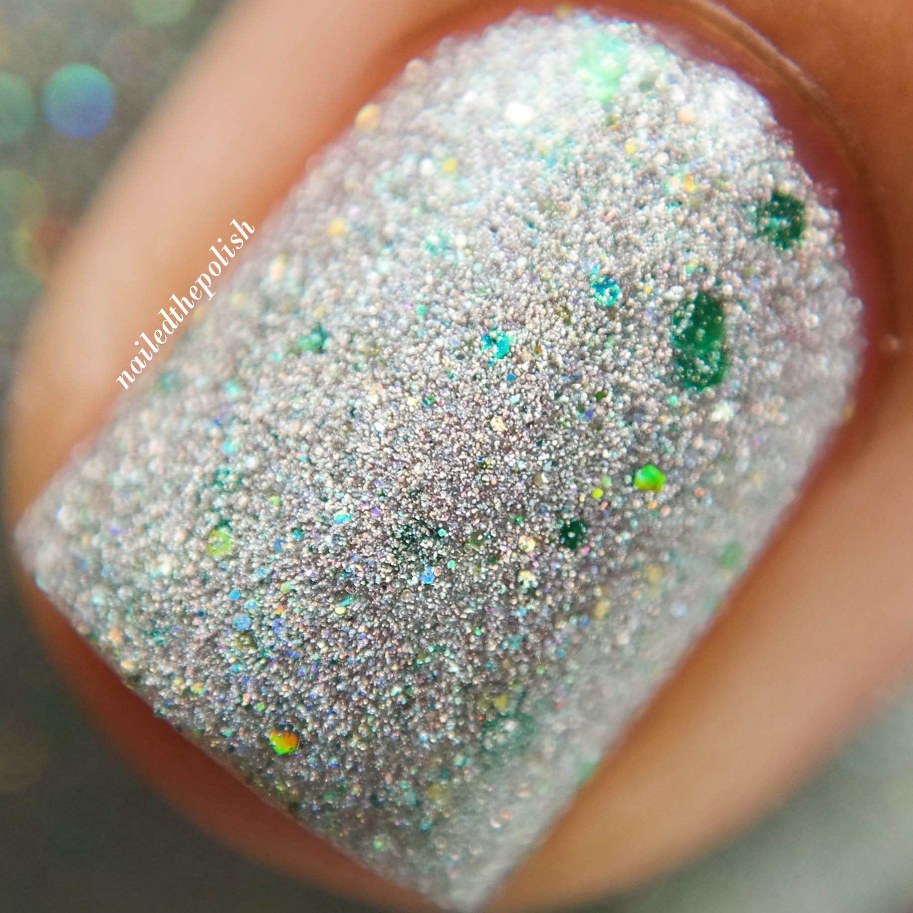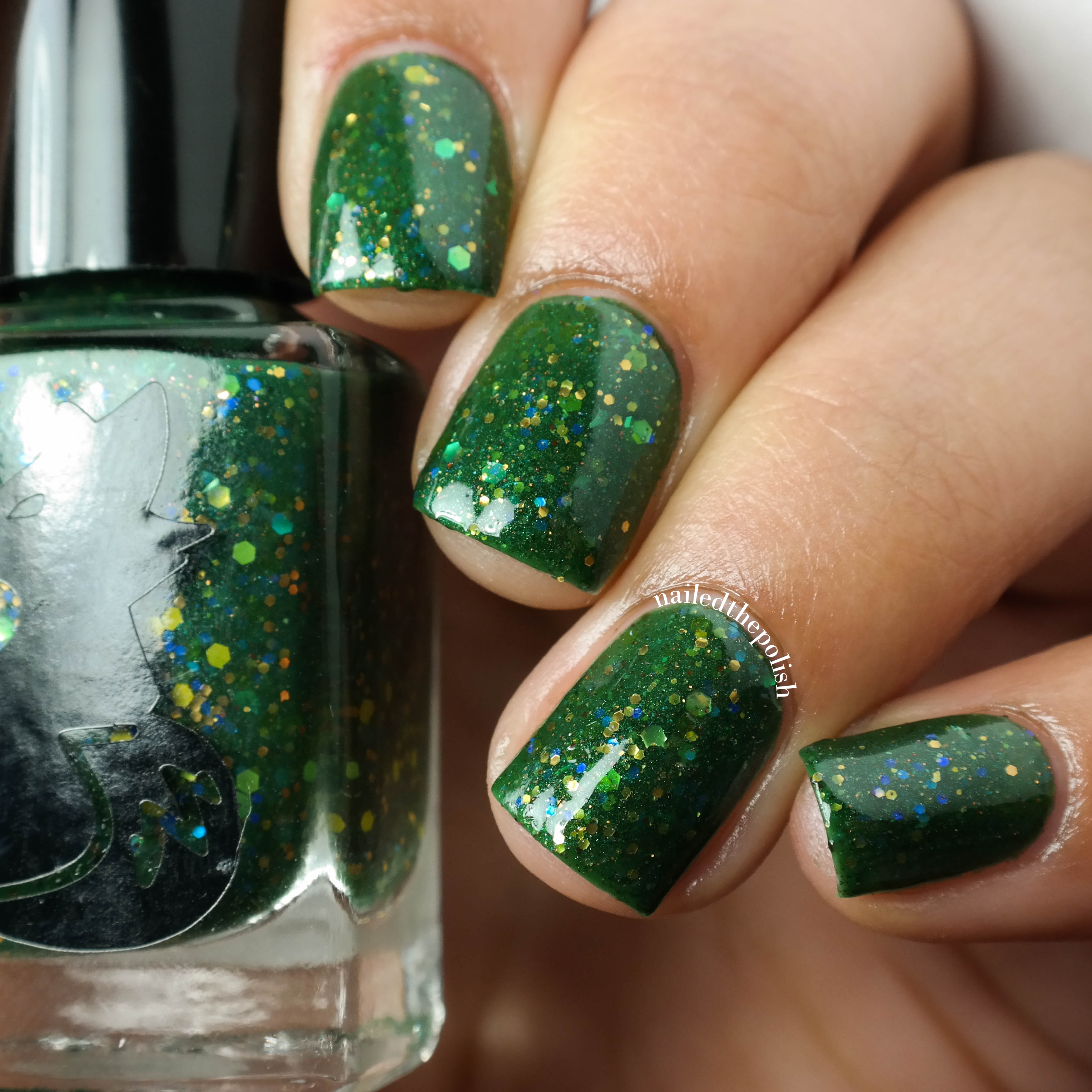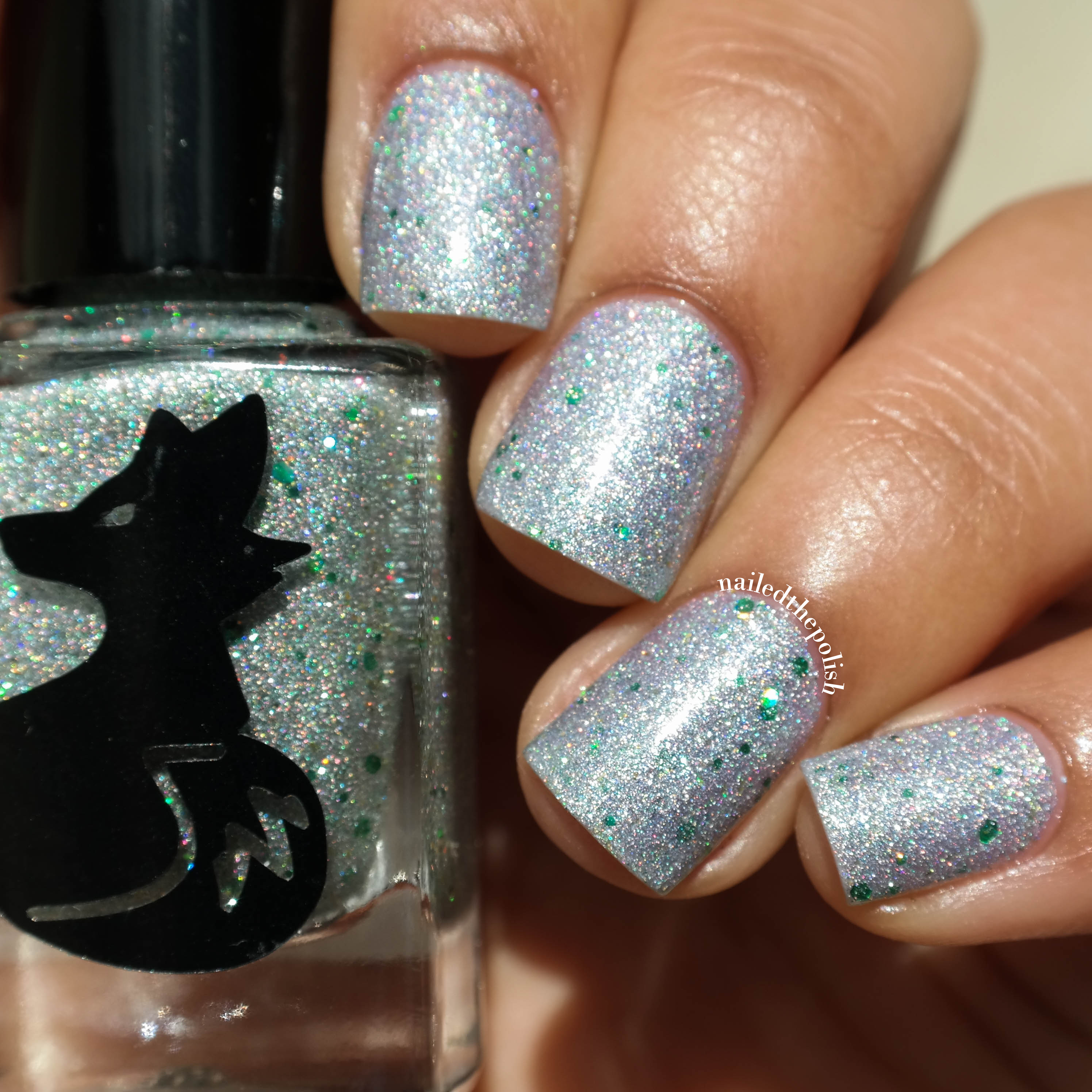 Fields of Holo is a holographic silver micro glitter with scattered green holographic hex glitters. Two regular coats with top coat. I’m still in shock that I was able to achieve such opacity in just two regular coats, no sponging! So much holo, so much sparkle, so much happiness!