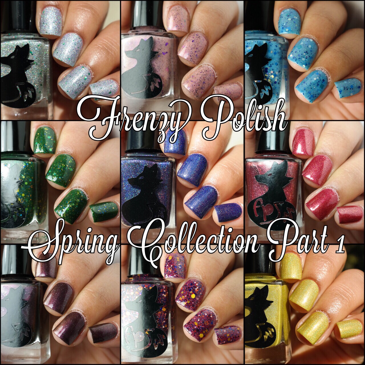 Happy Friday everyone! Today I have for you swatches from Frenzy Polish‘s new Spring Collection releasing tonight at 9pm eastern! This collection consists 17 polishes – holos, glitters, jellies, crellies, creams, flakies – there’s something for everyone! I will be reviewing part 1 which consists the 9 polishes shown in the collage below.