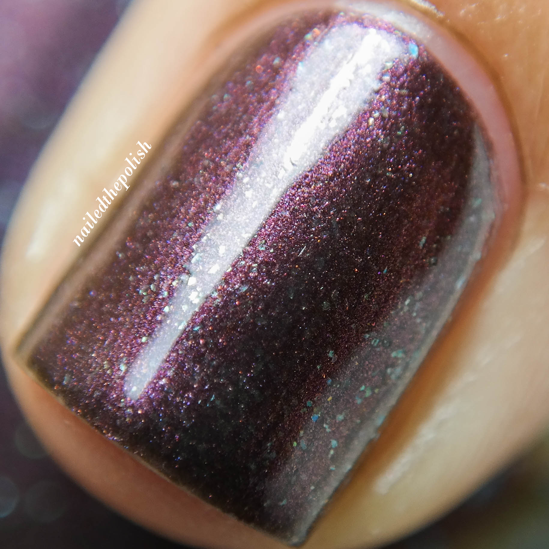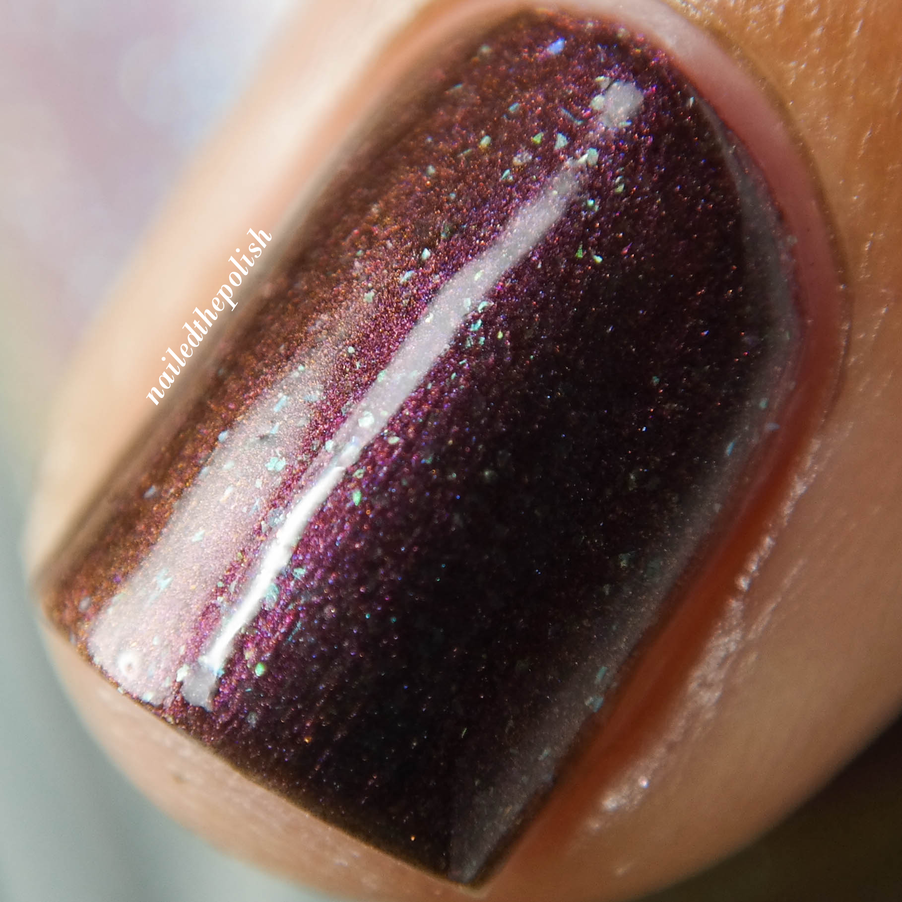 In Like a Lion… is a duo-chrome creme polish that shifts from a light plum to a milk-chocolate brown with color shifting glass flakes. Two coats with top coat. The glass flakes definitely make this polish for me.
