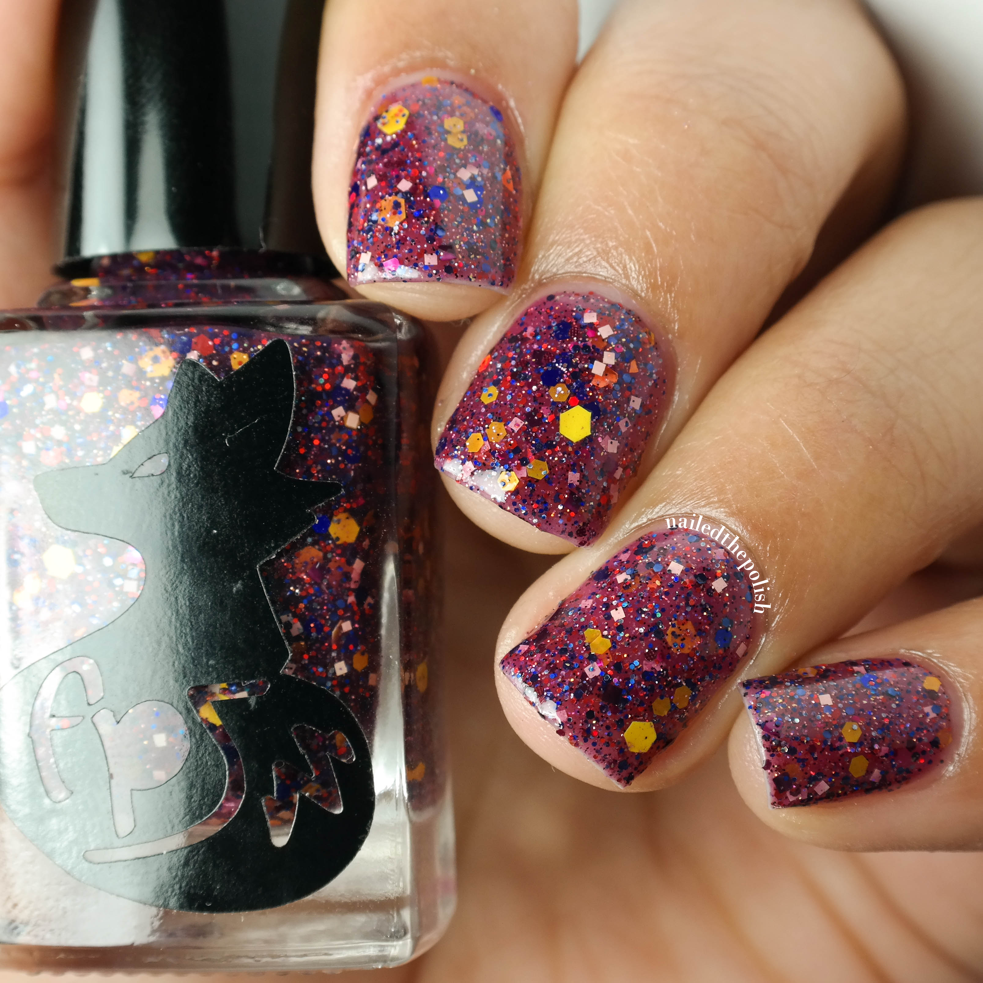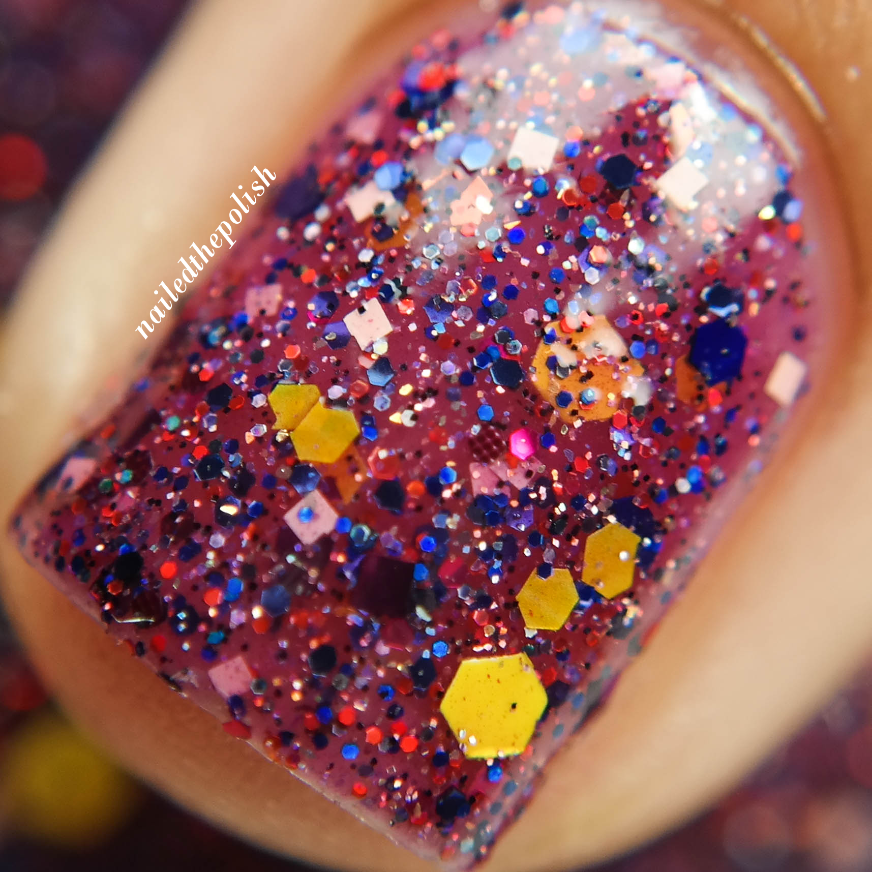 Iris Fields is a berry jelly polish that is packed with dark blue, red, and yellow hex glitters in various sizes, matte white square glitters, and various color micro glitter. Two coats with top coat. This polish is so… squishy! There is no fishing required and the formula is amazing considering the type of polish this is.