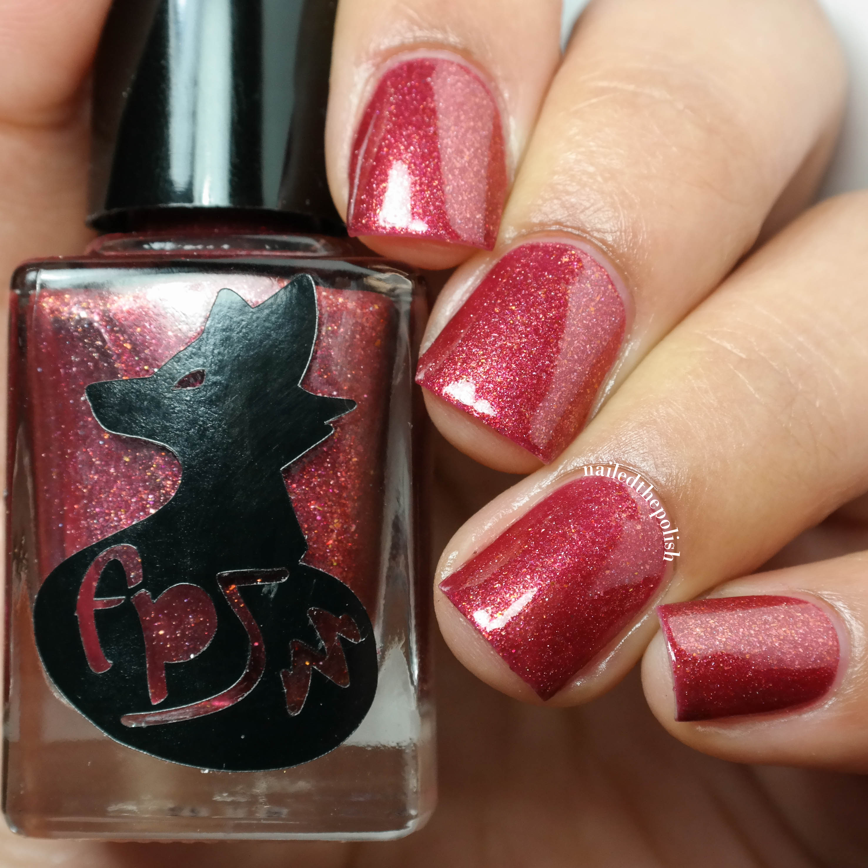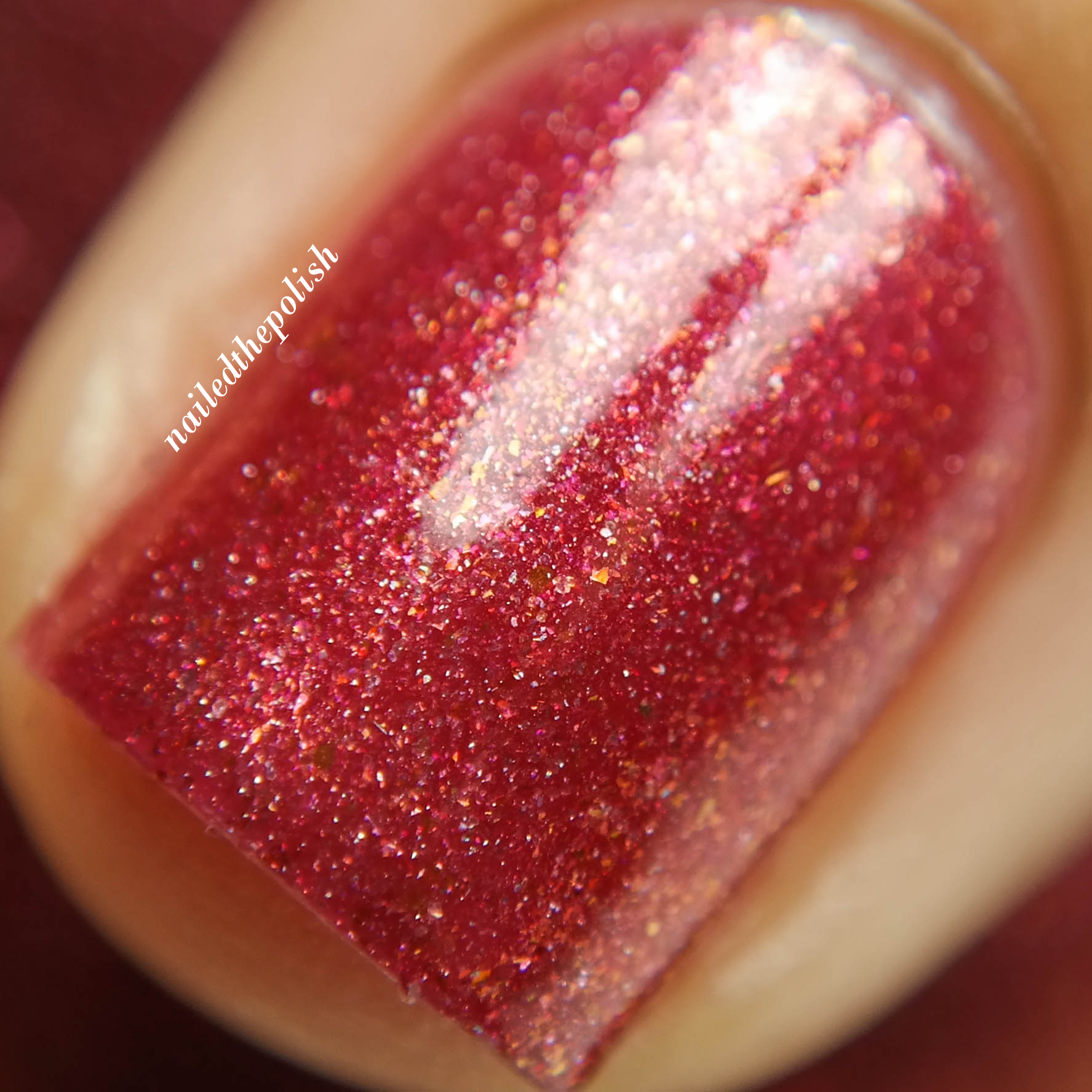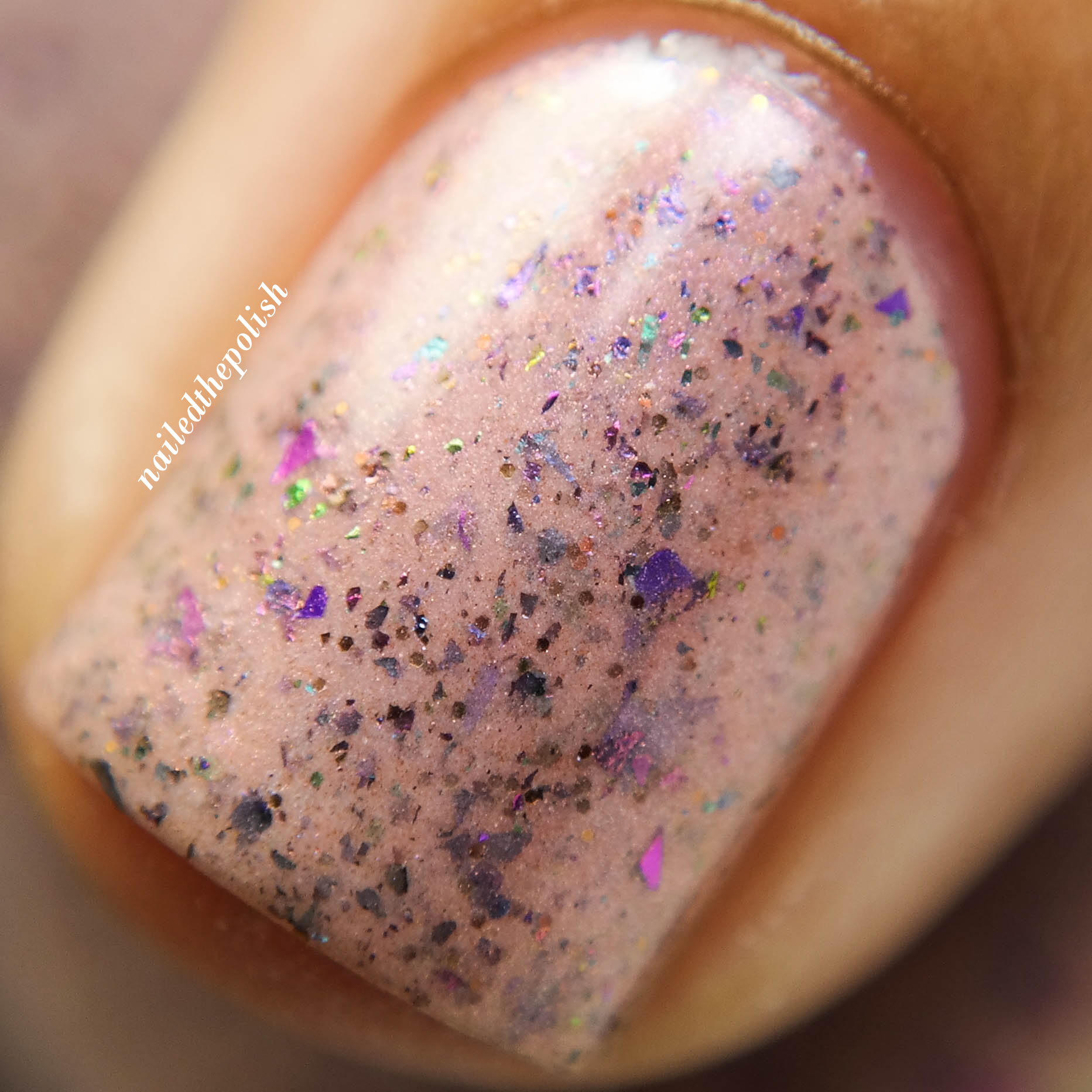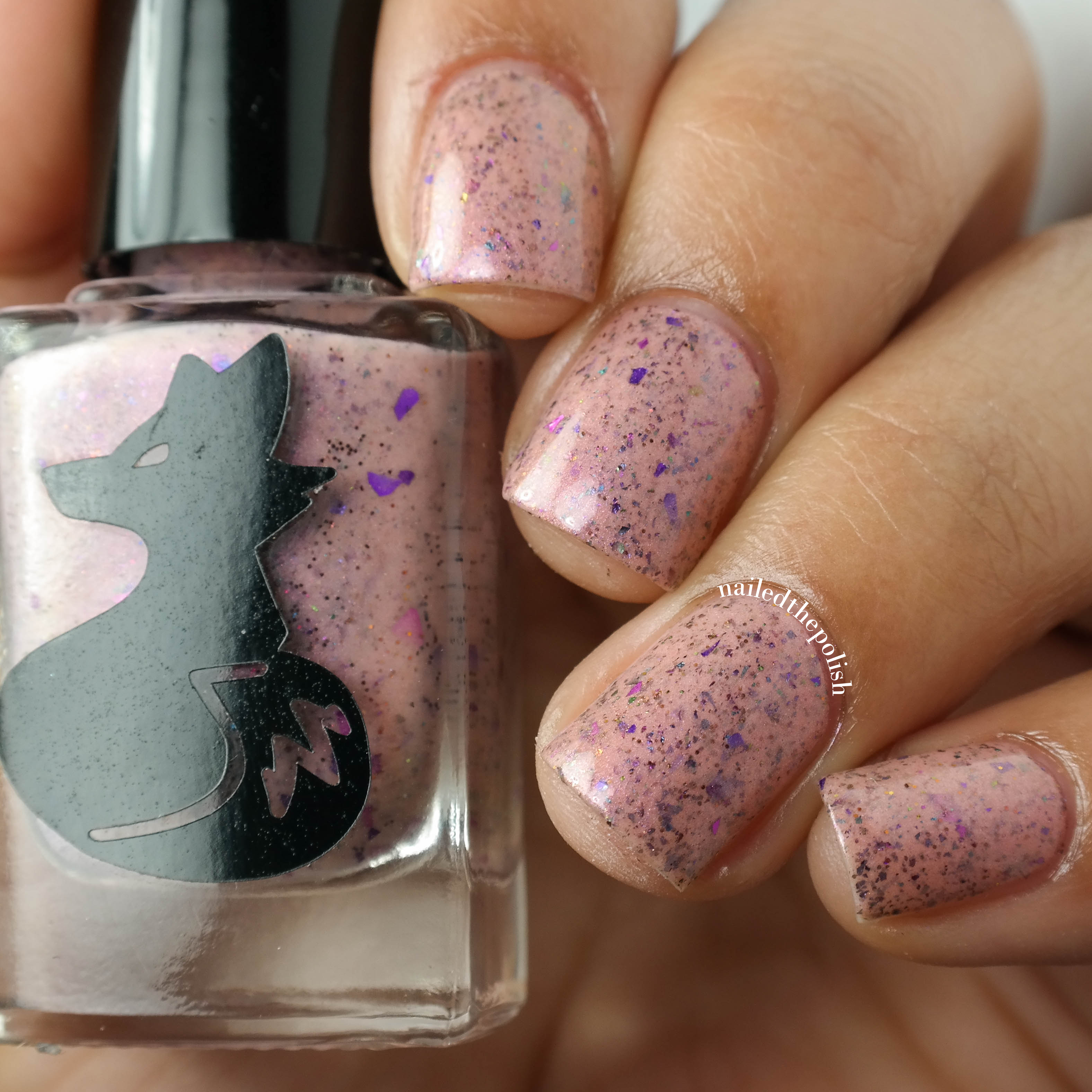 …Out Like a Lamb is a soft pale pink creme with pink/purple shimmers, rainbow multichrome flakies, and red and gold micro glitters. Two coats with top coat. All the shimmers, flakies, and glitters flow so well with each other that I just wanna cuddle with this polish. I don’t know how else to explain it!