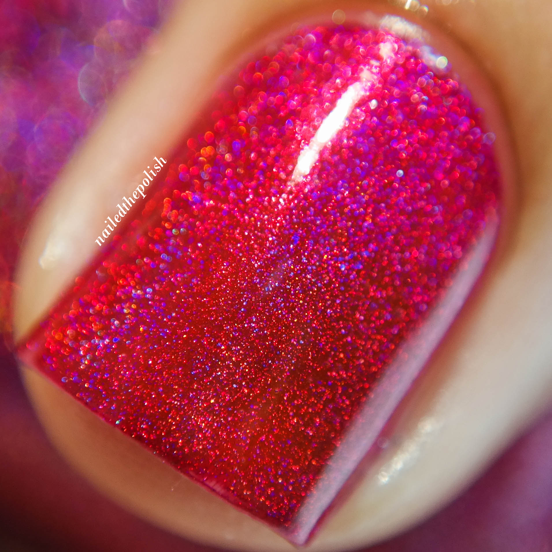 976-Babe is an intense berry red holo with added purple shimmer. Shown here is ONE coat with top coat. I am OBSESSED with this baby. I experienced some staining at the base of my nail when I removed the polish but it was totally worth it! What makes this polish is the purple shimmer which is more like a flash because it’s always present.