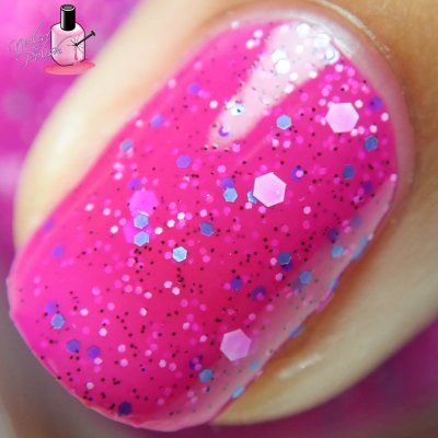 Fresh Watermelon is a bright red pink crelly with neon yellow/green micro glitters and black circle and hex glitters of  different sizes. Shown here is two coats plus top coat. My camera picked up this polish as more orange rather than red pink. In real life, I would say it’s red orange with a hint of pink. The formula of this polish is amazing! The glitters don’t have any effect in how this polish applies. One of the best crelly formulas I’ve swatched!