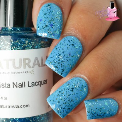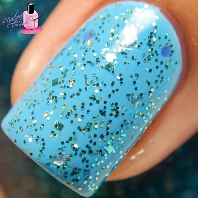 Moon Cosmic Blast is a turquoise jelly filled with teal, silver, and gold glitters of various size and shape. Shown here is two coats over two coats of “Sky Me Mine” by Wet ‘N’ Wild plus top coat. This is a polish that can be worn alone or as a glitter topper. It is easy to apply and I didn’t need to fish for any of the larger glitters, woo! A great polish to use when you want some sparkle but nothing too intense.