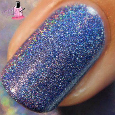 Storm is an indigo ultra holo with violet and indigo glass flecks. Shown here is two coats plus top coat. This polish is so holographic that I could barely see the glass flecks – not that that’s a bad thing! Just like Paradise, amazing formula! This polish is one that I would classify as “blurple” because in some lighting it was indigo but in others it was almost a sapphire shade.