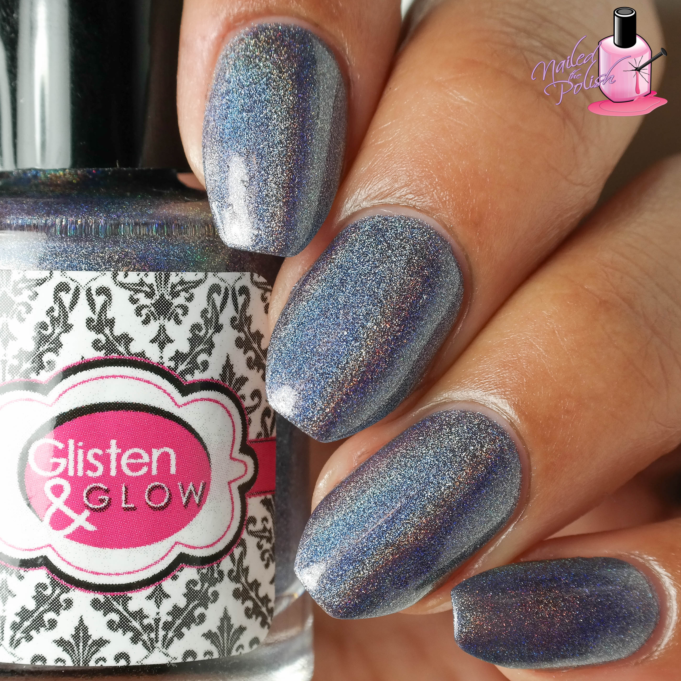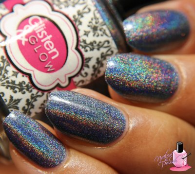 Blue on Blue is a steel blue linear holo. Shown here is two coats plus top coat. In some lighting, this polish has a purple hue while in others a little gray. The formula is perfect and has great coverage!