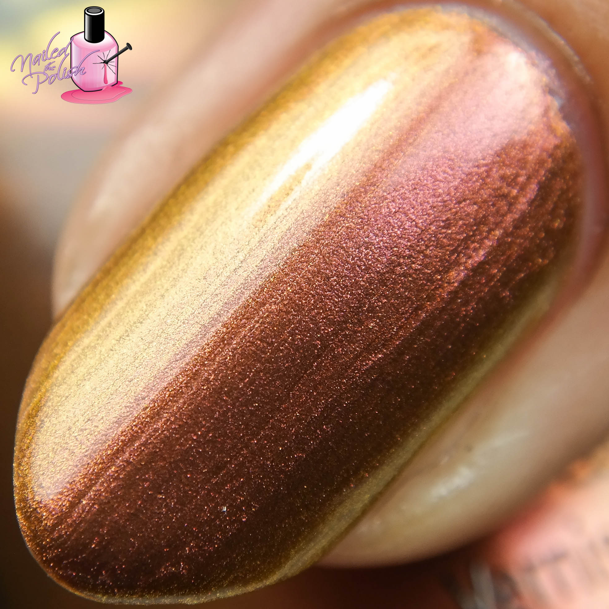 Cabin Fever is a pink to copper duochrome. Shown here is two coats plus top coat. I tried to control this polish as best as possible but I ended up with a thicker second coat than I wanted which translated into pretty noticeable brush strokes. I tested a nail with three thin coats and it was less streaky. Brush strokes aside, the shift is amazing! One moment it’s a bright copper, the next a rich rosy pink!