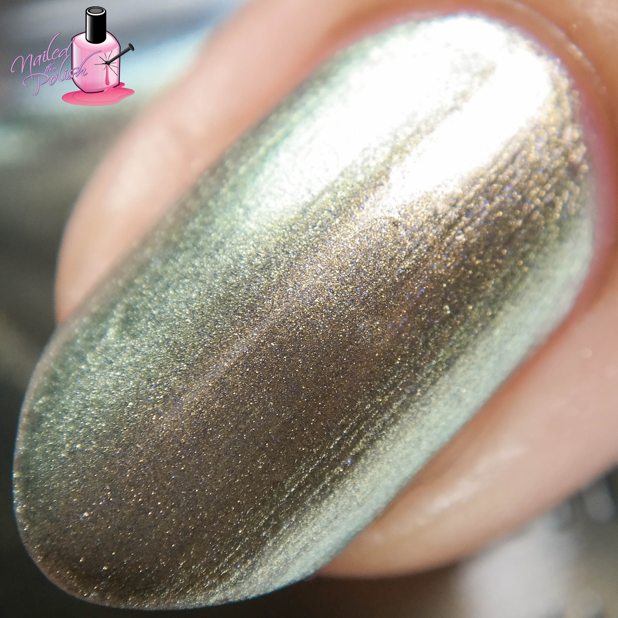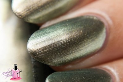 Gone Glamping (LOVE the name!) is a gold to green duochrome. Shown here is two coats plus top coat. I didn’t have as much of an issue with brush strokes but they are there. The shift isn’t as strong as Cabin Fever but it’s just as gorgeous! I have a lot of duochromes in my polish collection but none with this shift. It’s so lovely!