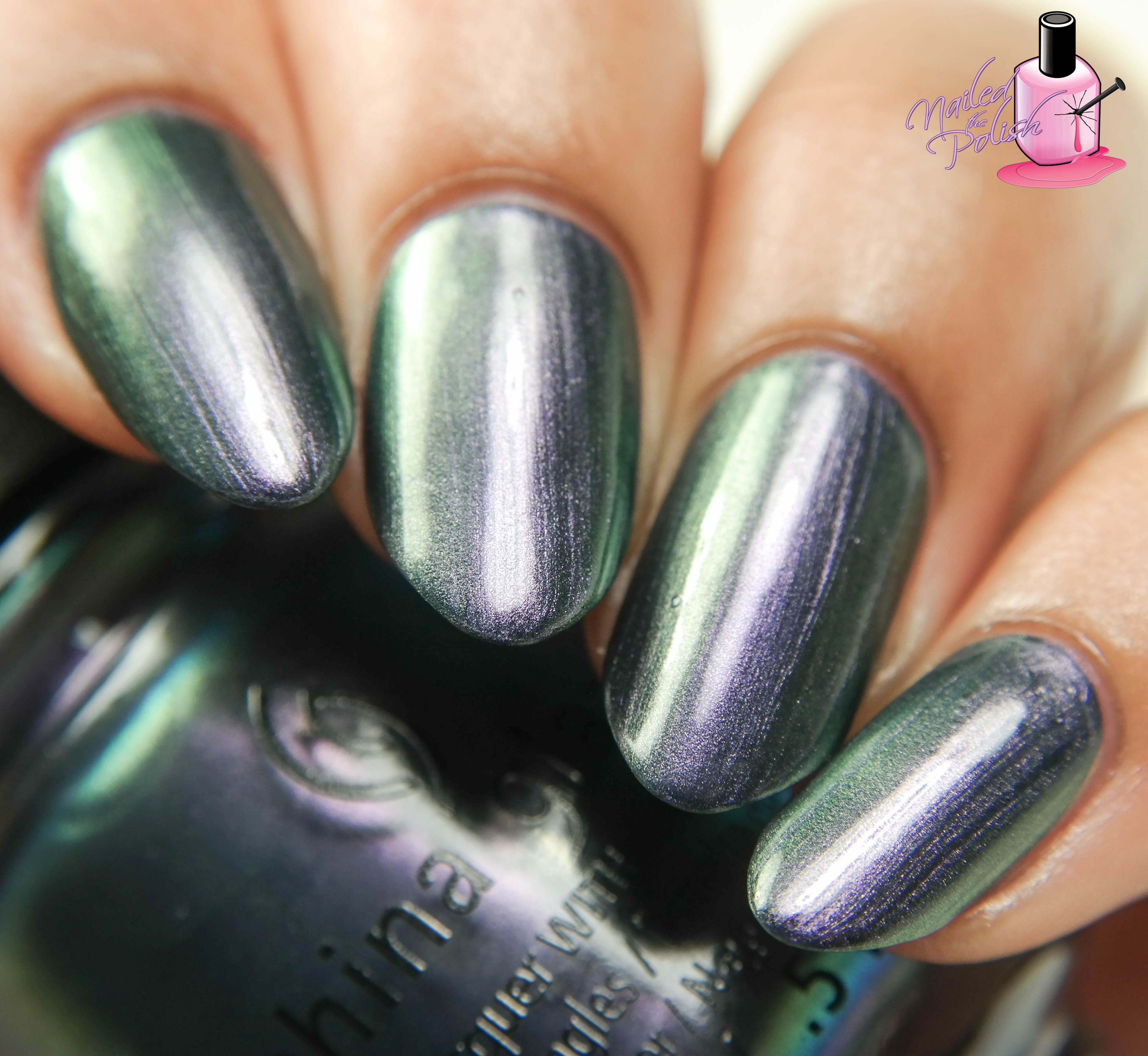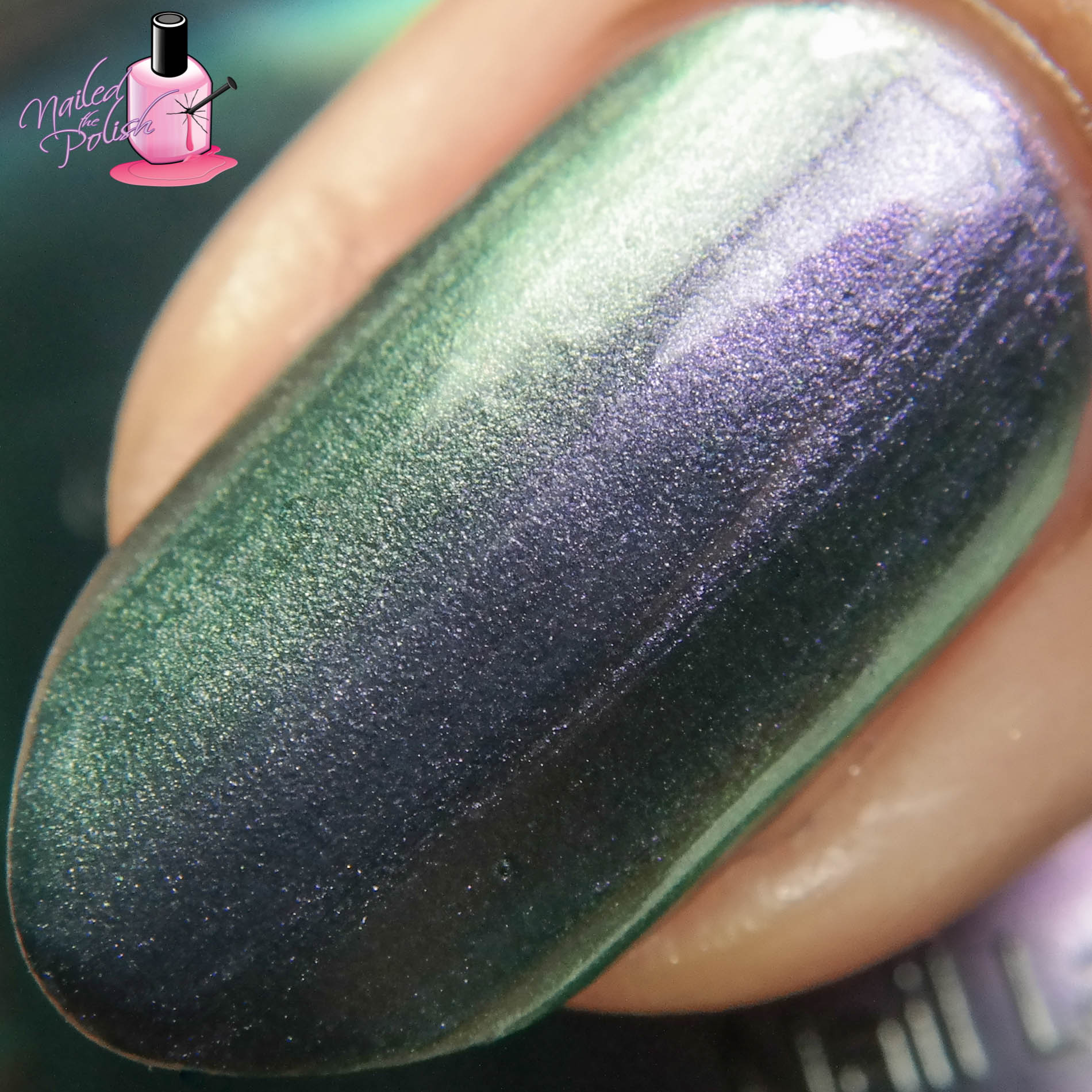 Pondering is an amethyst to emerald green duochrome. Shown here is three coats plus top coat. This polish is the sheerest of the three duochromes but it builds up very well. Really easy to apply and the dry time is great! From the bottle, this looks like a multichrome with the third color being a purple grey but I couldn’t get that color to show up on my nails. Either way, the two that do show are gorgeous!