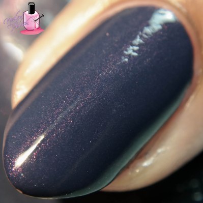 Sleeping Under the Stars is a dusty navy blue creme with purple to gold shimmer. Shown here is ONE generous coat plus top coat. The shimmer in this polish is stunning and quite noticeable in person. Unfortunately, it was hiding from my camera in my swatch picture 😦 but I did manage to capture it in the macro below, yay!