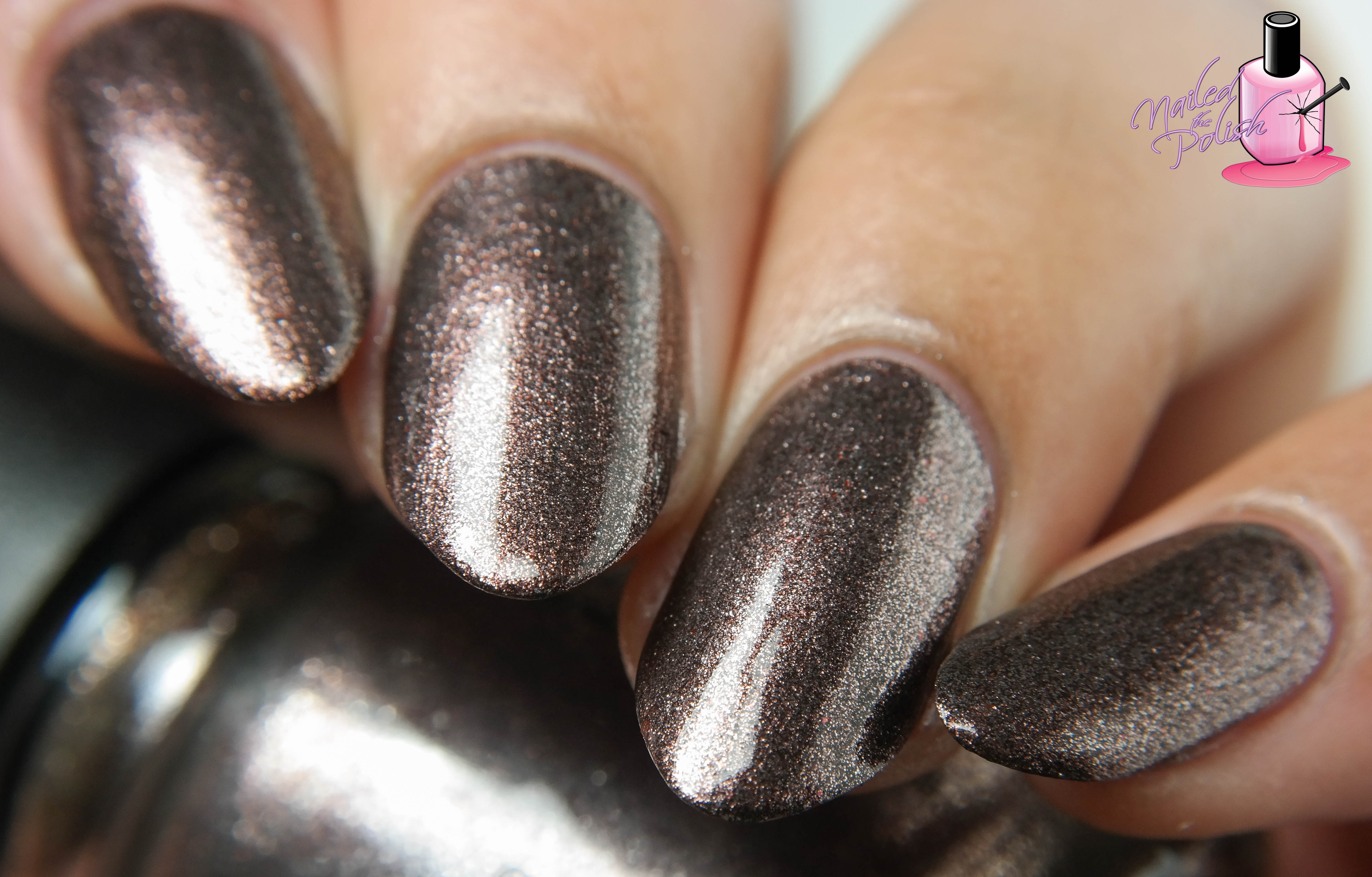Wood You Wanna? is a deep chocolate brown and silver metallic. Shown here is two coats plus top coat. I’m really loving this shade! The chocolate brown and silver work perfectly to create a beautiful metallic glow. Application is super easy and the formula is awesome!