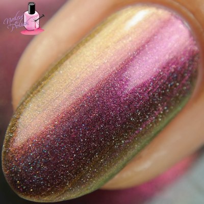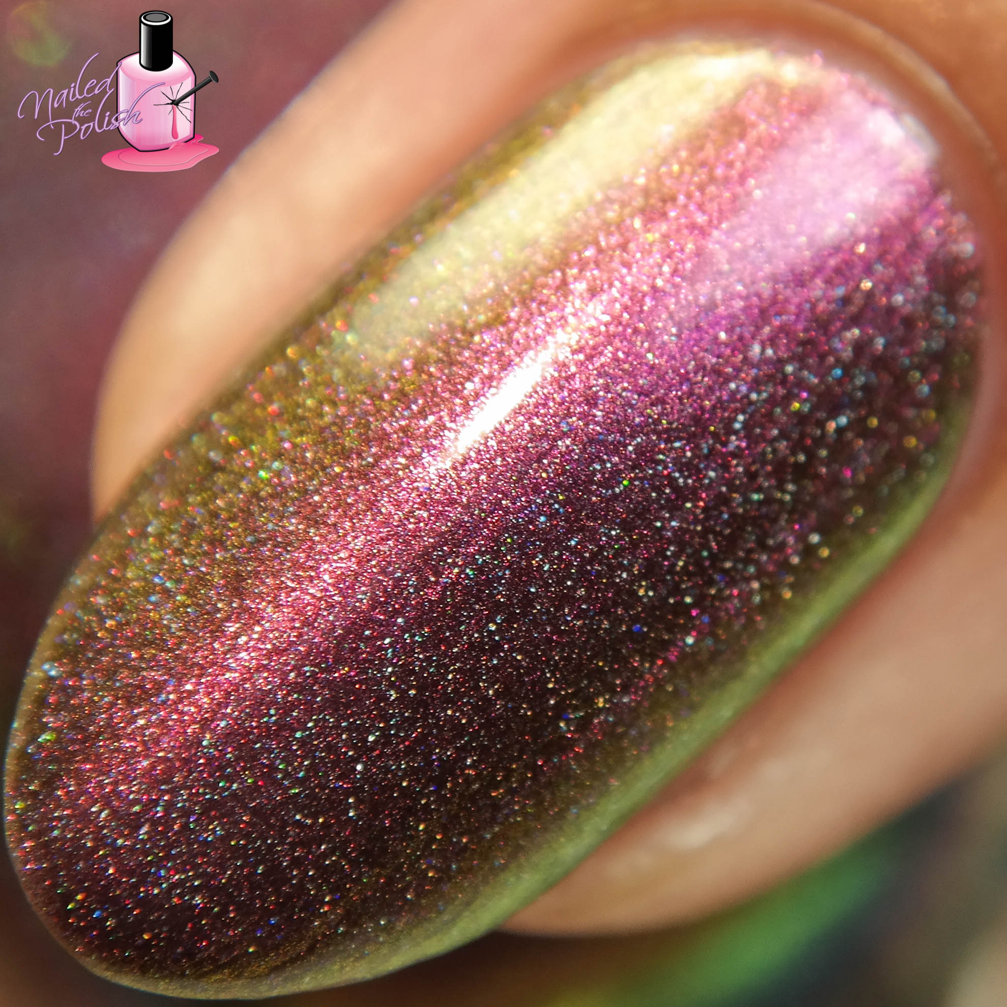 Cameo (H) is a holographic ultra chrome that shifts through pink, purple, copper, gold, and green. Shown here is two coats plus top coat. Sure, the formula is great. So is the coverage and the holo. But what’s really amazing is the shift. HOLY FREAKING COW. I saw every color that the description lists and was able to capture them all! Prepare yourself for lots of pictures…