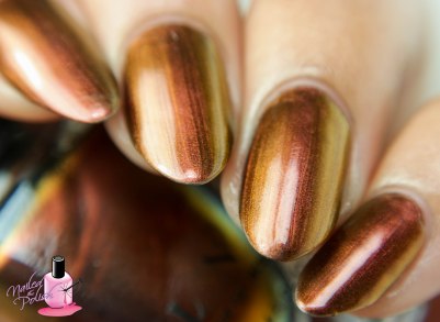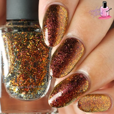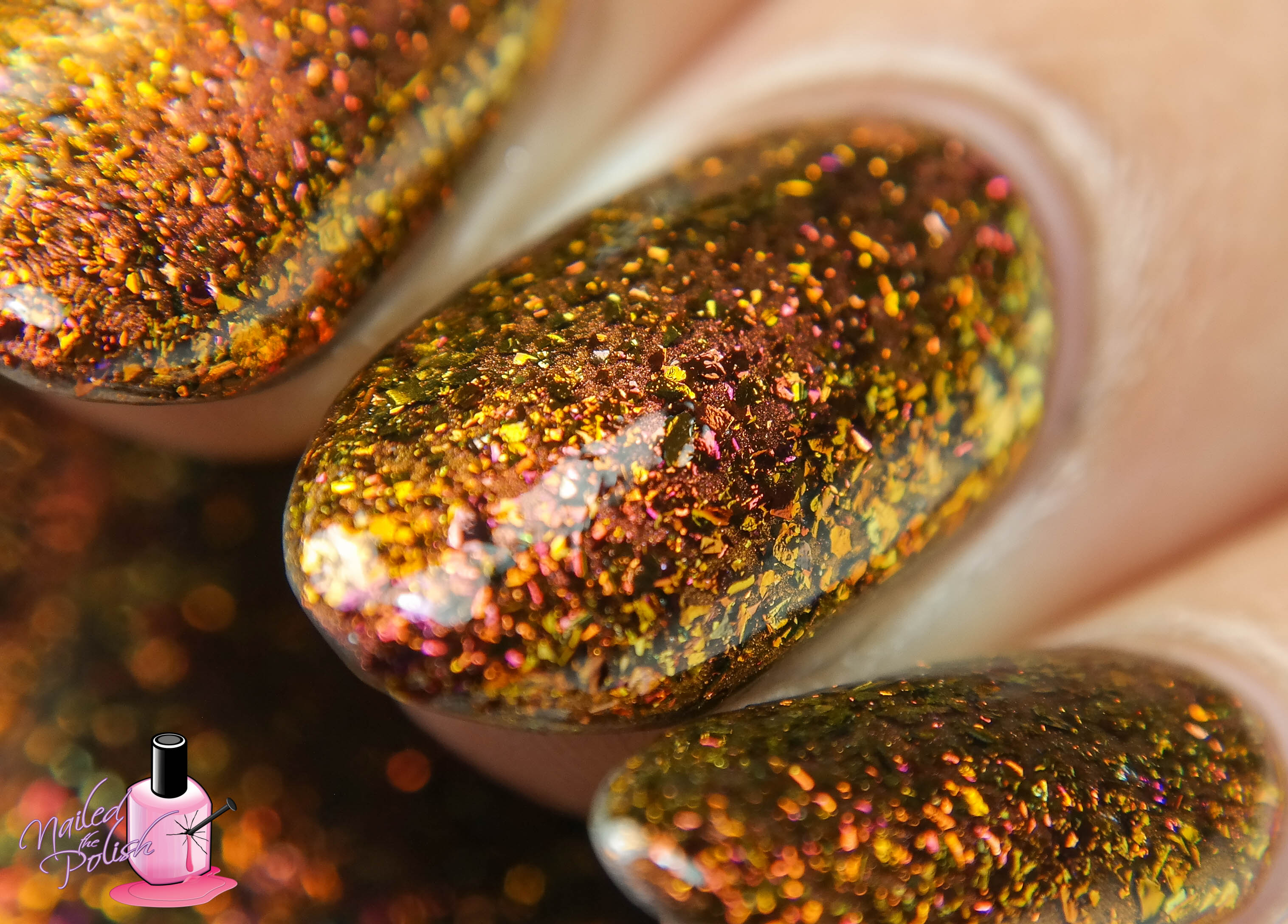 Glory is an ultra chrome flakie that shifts through red, orange, copper, gold, and chartreuse along with hints of other colors. Shown here is two coats over Greatness plus top coat. This polish is described as “Fall in a bottle” and I can’t argue with that. The color palette is gorgeous! This polish is very easy to apply. I had no issues with flakie placement or distribution. Not to mention, Glory and Greatness are a match made in polish heaven! ❤ I was very much obsessing over this look and wore it for a couple of days. 🙂