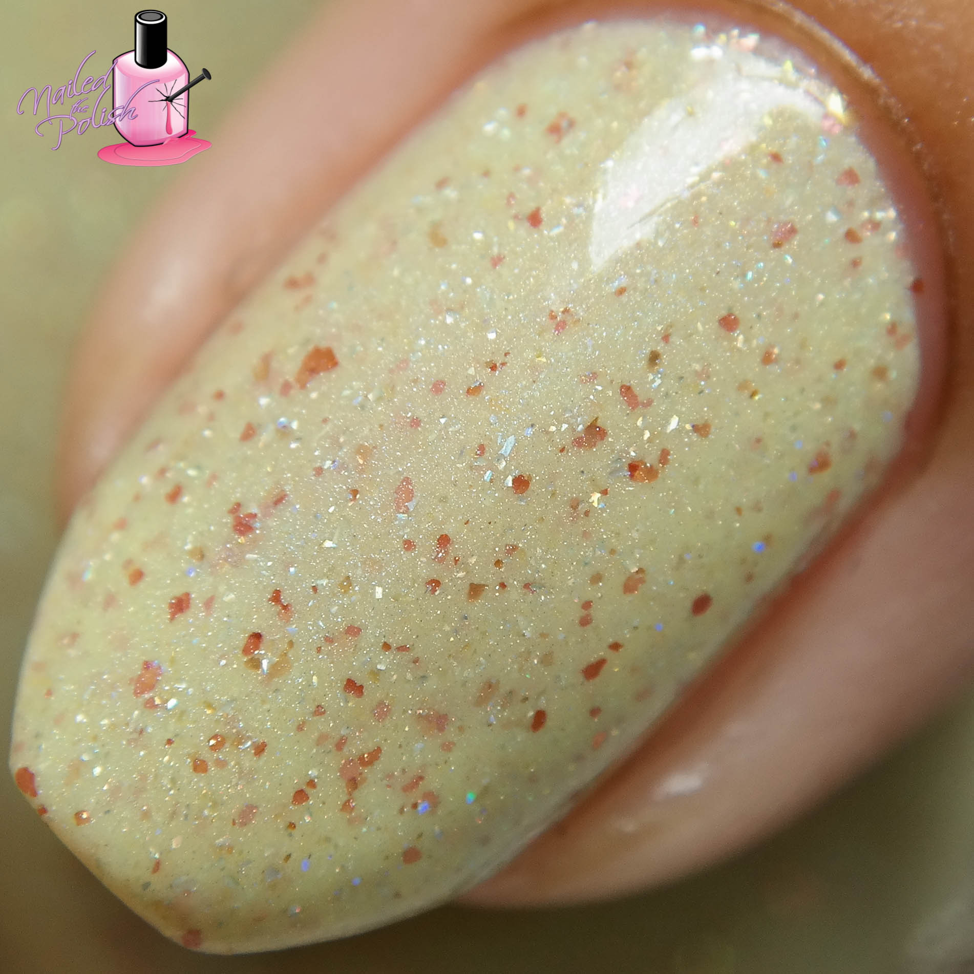Spiced Eggnog is an eggnog holographic creme with gold and burnt orange flakes that give it a speckled look. Shown here is two coats plus top coat. This was the one polish that I swatched before changing my nail shape back to almond so I apologize for the slight inconsistency in my pictures. Of all the polishes in this collection, this one definitely sticks out the most. It’s a unique shade that quite frankly could be a hit or miss. For me, it’s a total hit! The formula is spectacular and I love the finish! When I think of Spiced Eggnog, this is exactly what I think of – minus the holo 😛