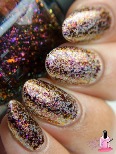 Last up is The Road to Awe – an ultra chrome flakie that shifts through purple, pink, wine, copper, and gold. Shown here is two coats over Iconic (from ILNP’s Fall 2014 collection) plus top coat. This polish also has a great formula and is packed with flakies. I coat would have easily sufficed but the flakie obsessed side of me wanted more! Like Cameo (H), the shift is remarkable. I love, love, LOVE the wide range of colors that this polish shifts through.