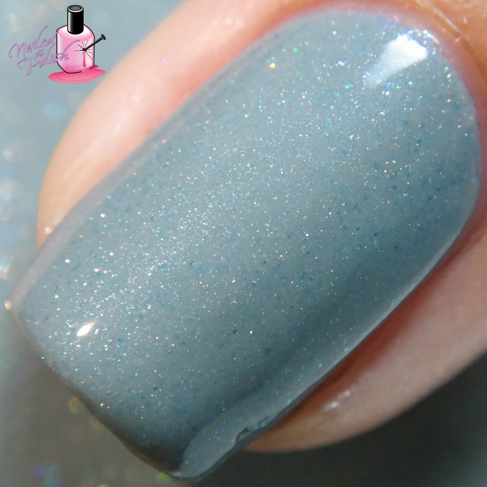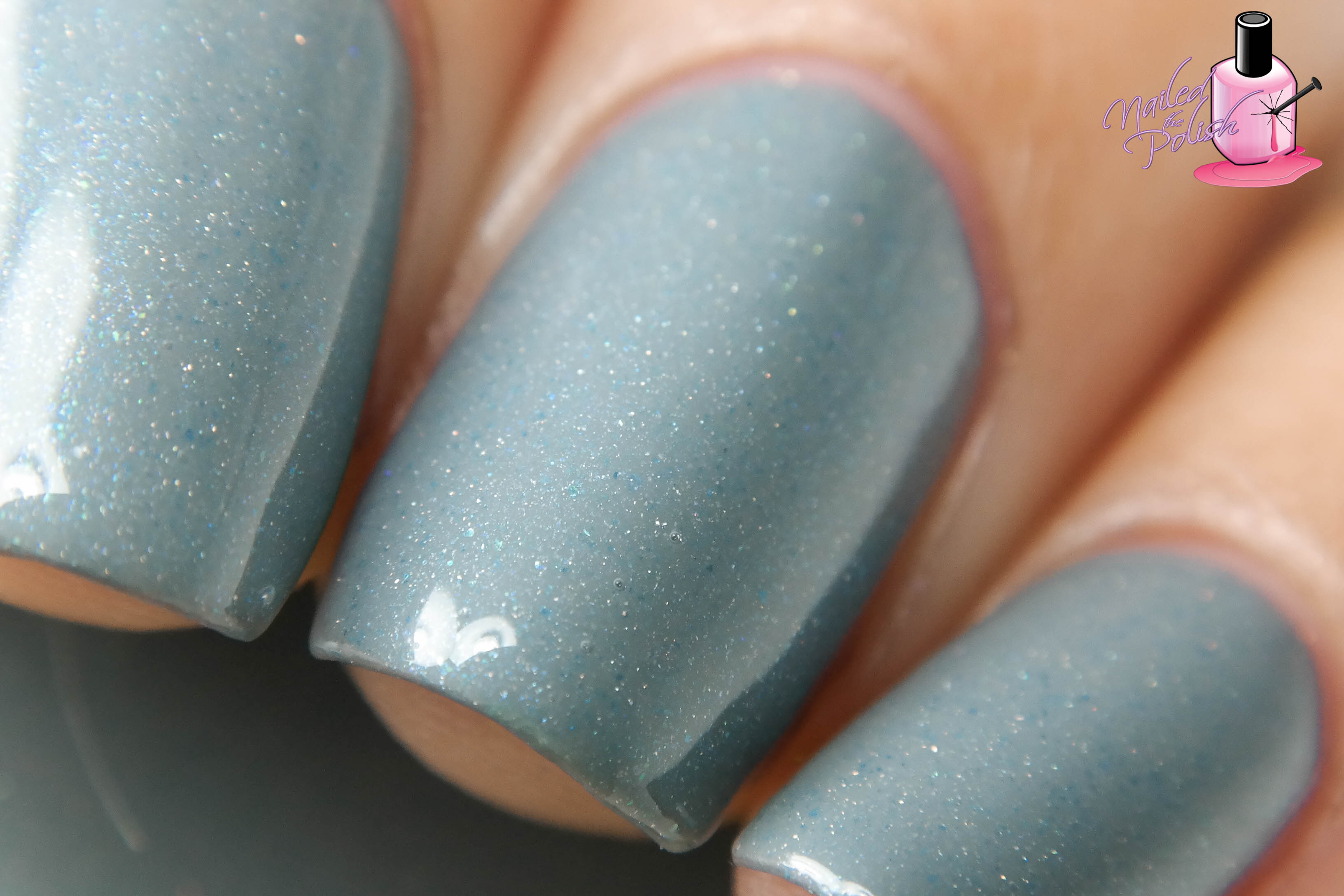 Winter Moon is a blue toned medium gray with light scattered holo, blue flash, and blue green sparkle. Shown here is three coats plus top coat. The formula is slightly thicker than the others in the collection so thin coats are best to avoid pooling and drying thick. With that being said, this polish builds opacity quite well and is easy to control. My favorite thing about this polish is how the blue green sparkle gives it a speckled look – so unique!