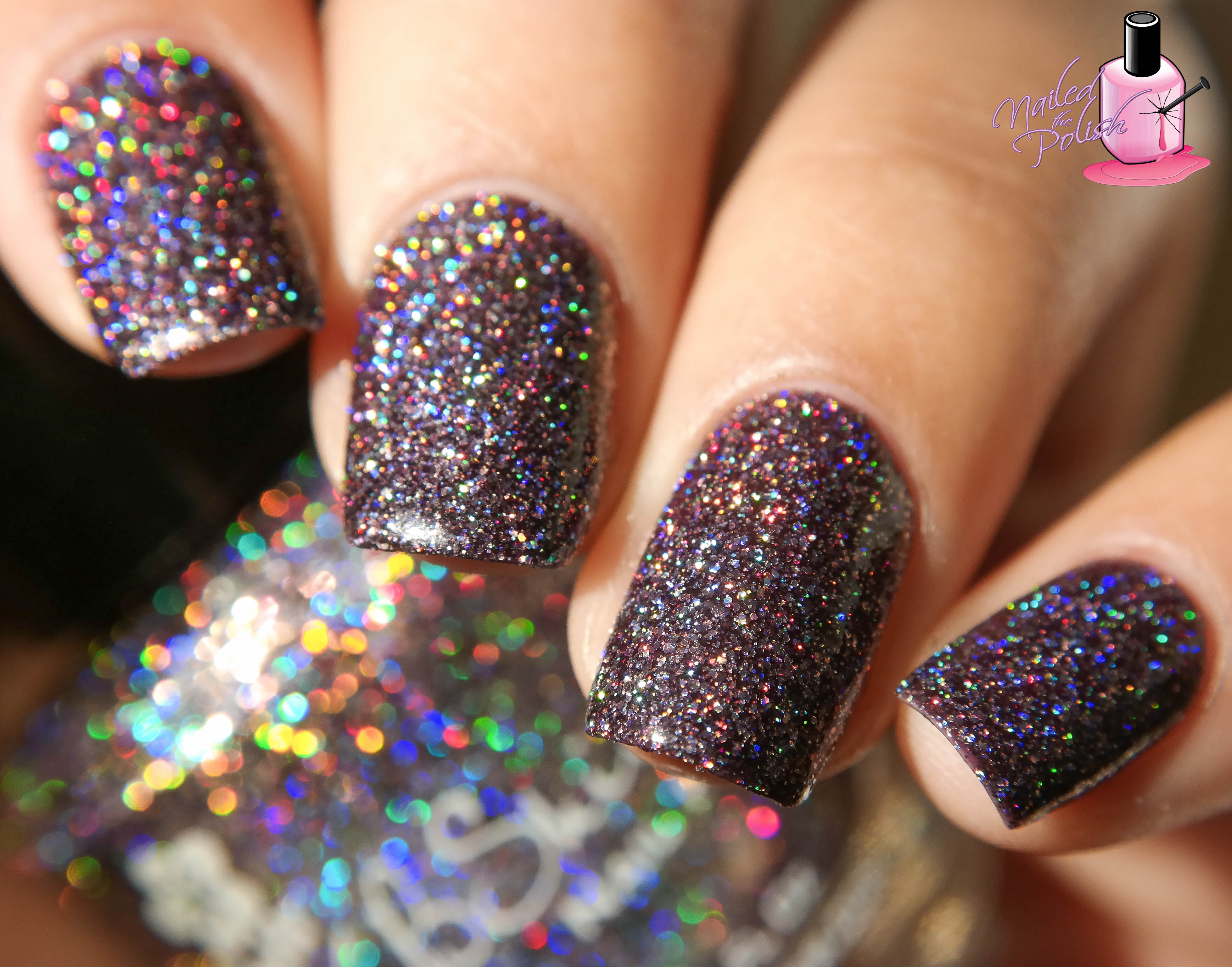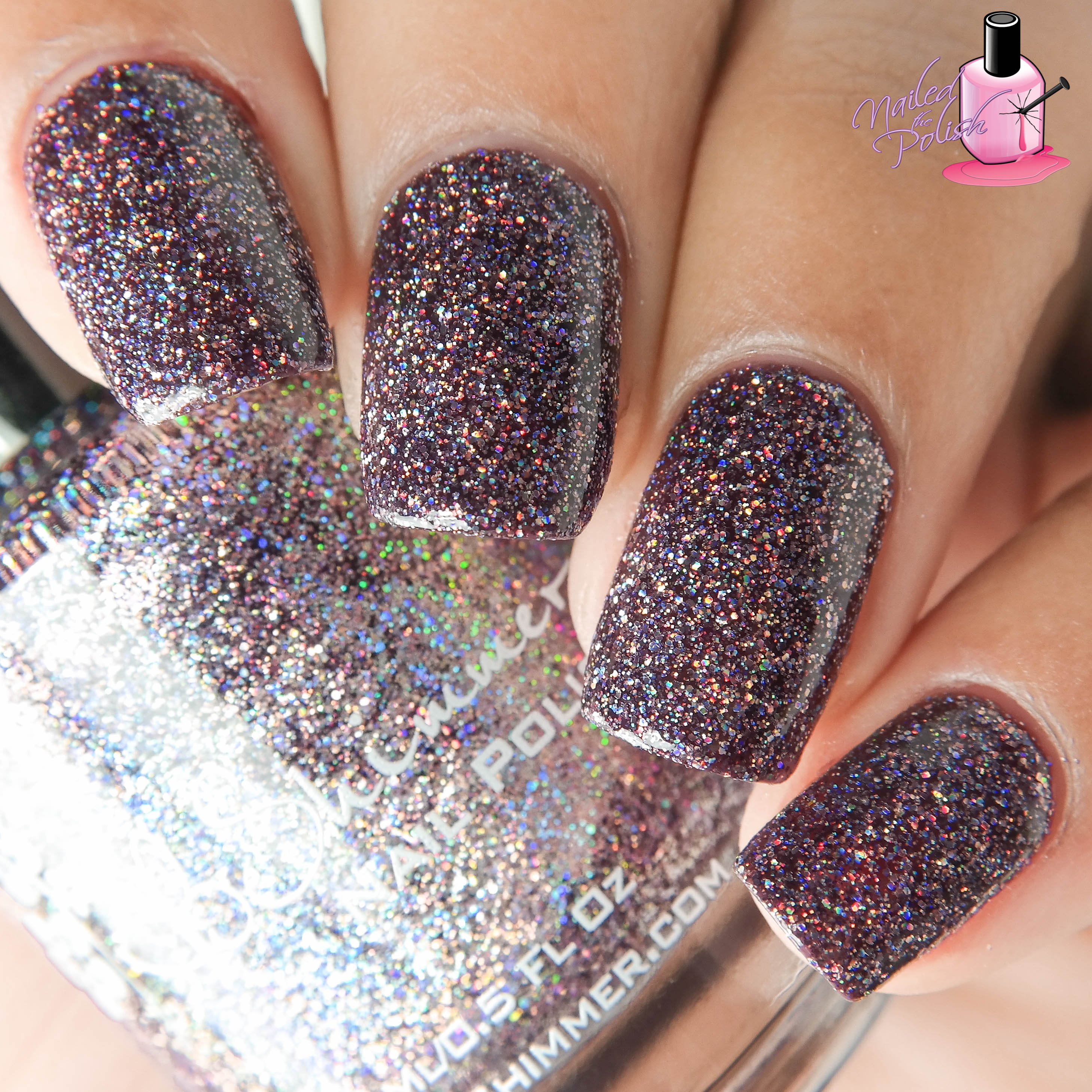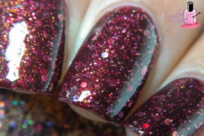 Last up is KBShimmer’s contribution: Bling Out Loud – a sheer grape jelly with TONS of added silver holographic micro glitter. Shown here is two coats plus top coat. This polish is SO FULL OF GLITTER yet is painless to apply! It’s really easy to control and levels exceptionally well. This polish could not have been named any better because it definitely brings the bling! You better have your sunglasses handy for this baby! When I saw this polish, I immediately gasped followed by lots of oohs and aahs when I got it into the sun. To say I am obsessed with this polish is a massive understatement.