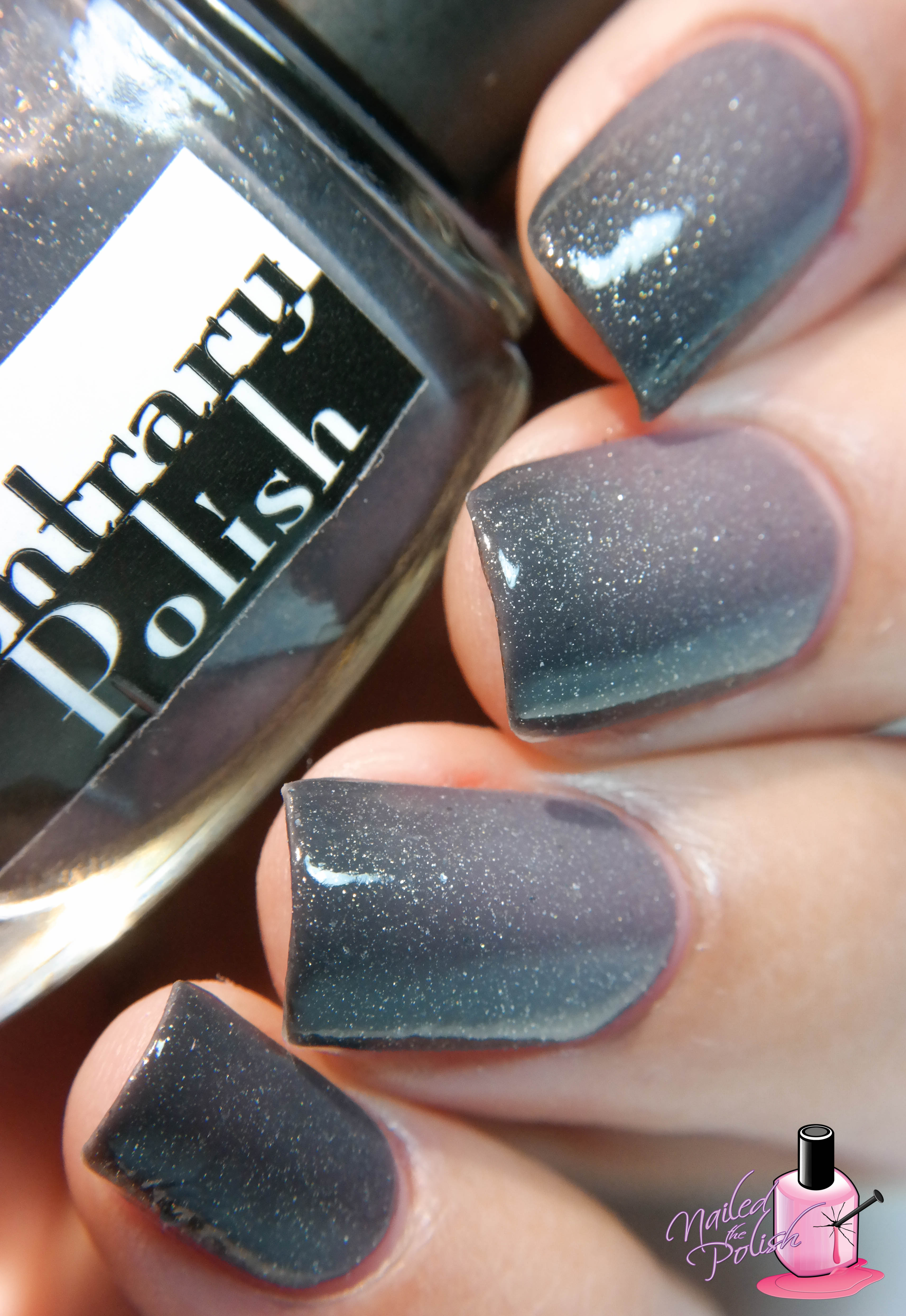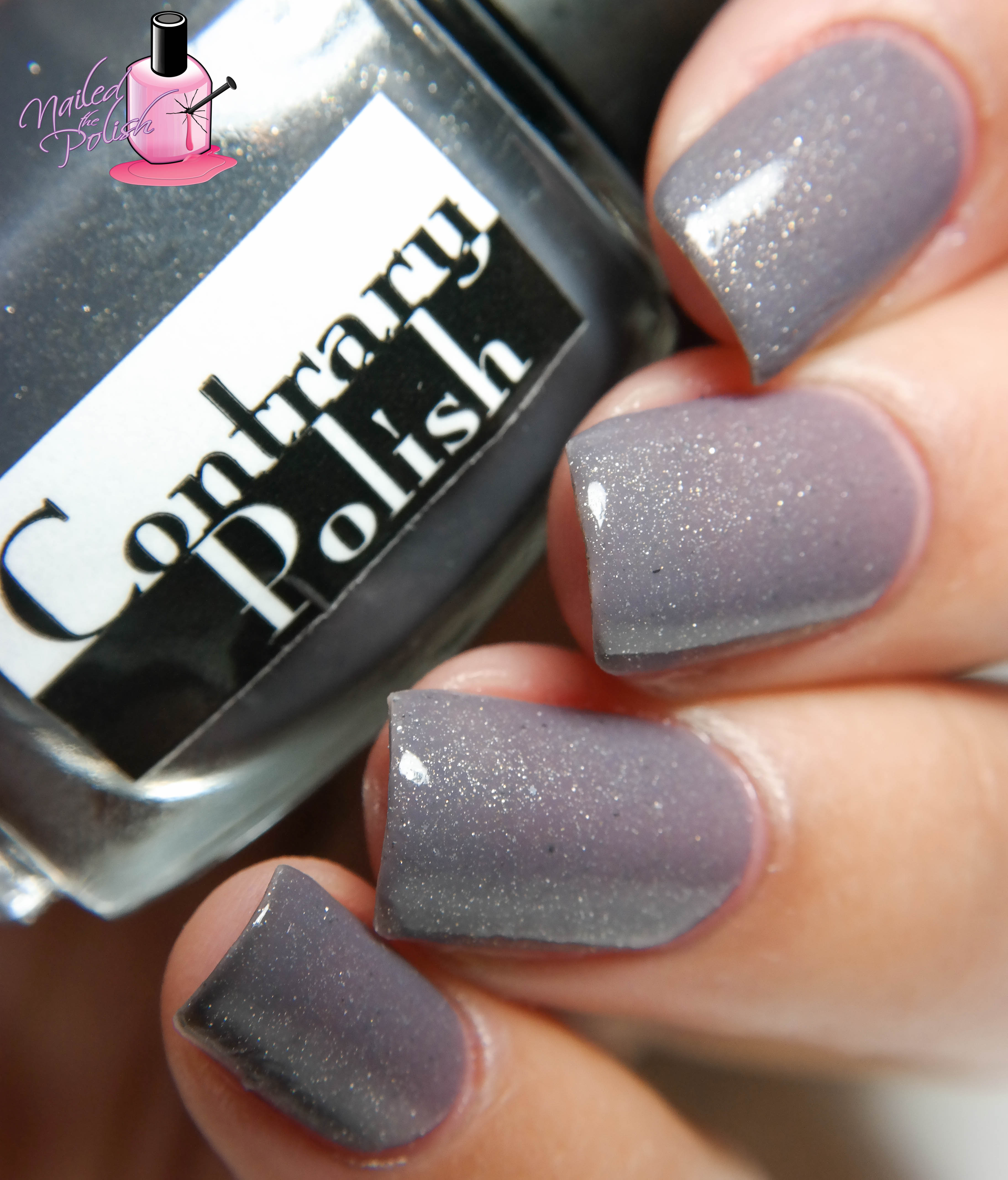 Ch-Ch-Changes is a thermal polish with added gold and silver micro flakes that goes from dark grey to light grey when warm. Shown here is three coats plus top coat. This polish is really easy to apply and control. It also builds opacity quite well. It dries to a satin finish so a top coat is recommended. Contrary Polish is another brand that I was not familiar with prior to this box but now that I am, I want more! I wasn’t sure how much I was going to like this polish when I saw it in the bottle but once applied, I fell in love!