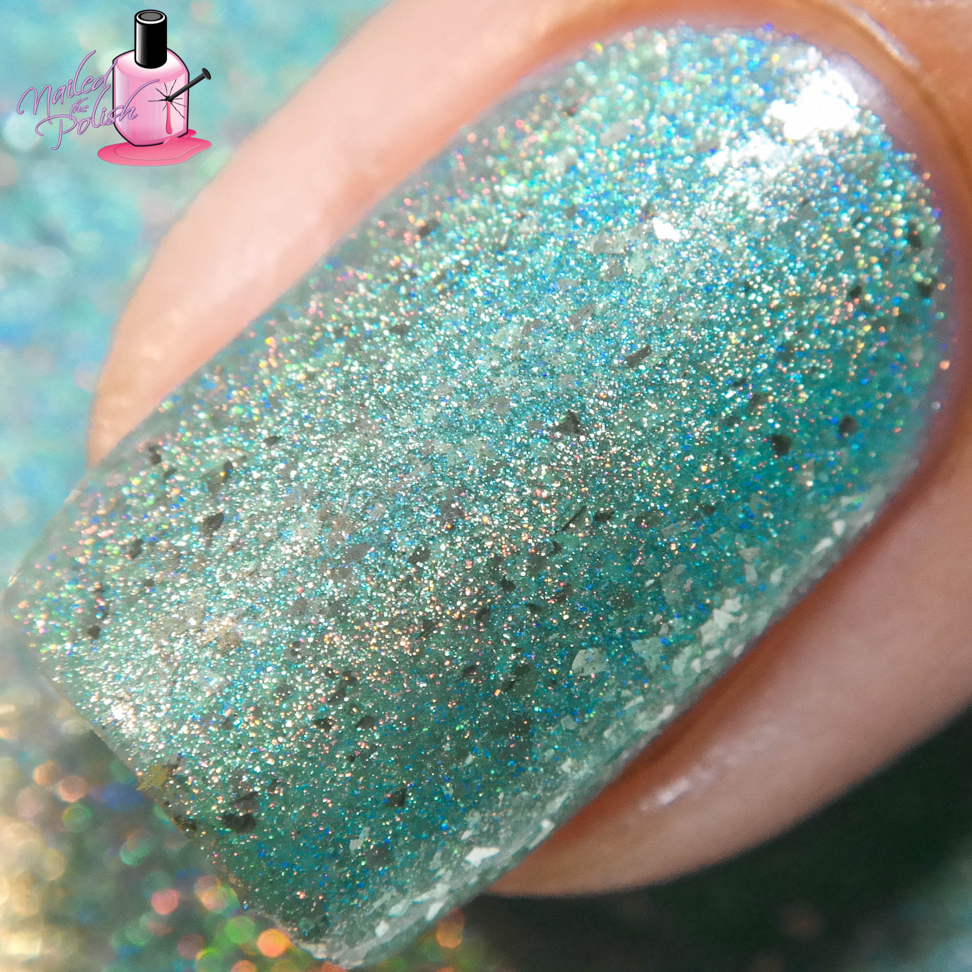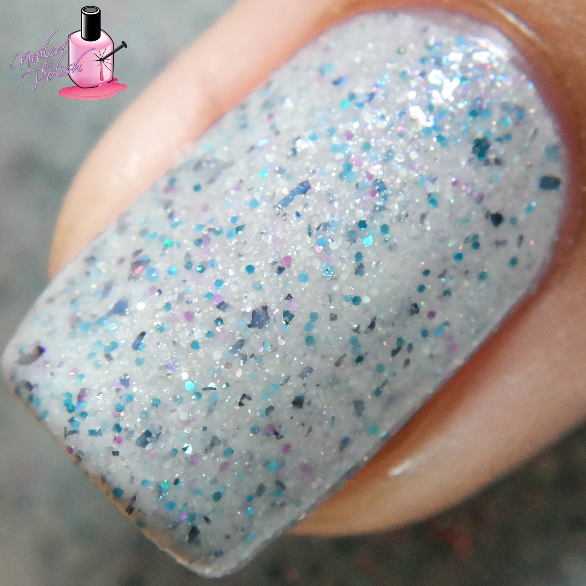 Feelin’ Frosty by Polish ‘M is a light grey crelly with violet shimmer, sky blue holographic micro glitters, and teal and purple flakies. Shown here is two coats plus top coat. Such a great formula for a polish with so many added elements! It is really easy to control and I had to do ZERO clean up after application. I am obsessed with the flakies in this polish! They are absolutely wonderful! This polish has winter written all over it 🙂