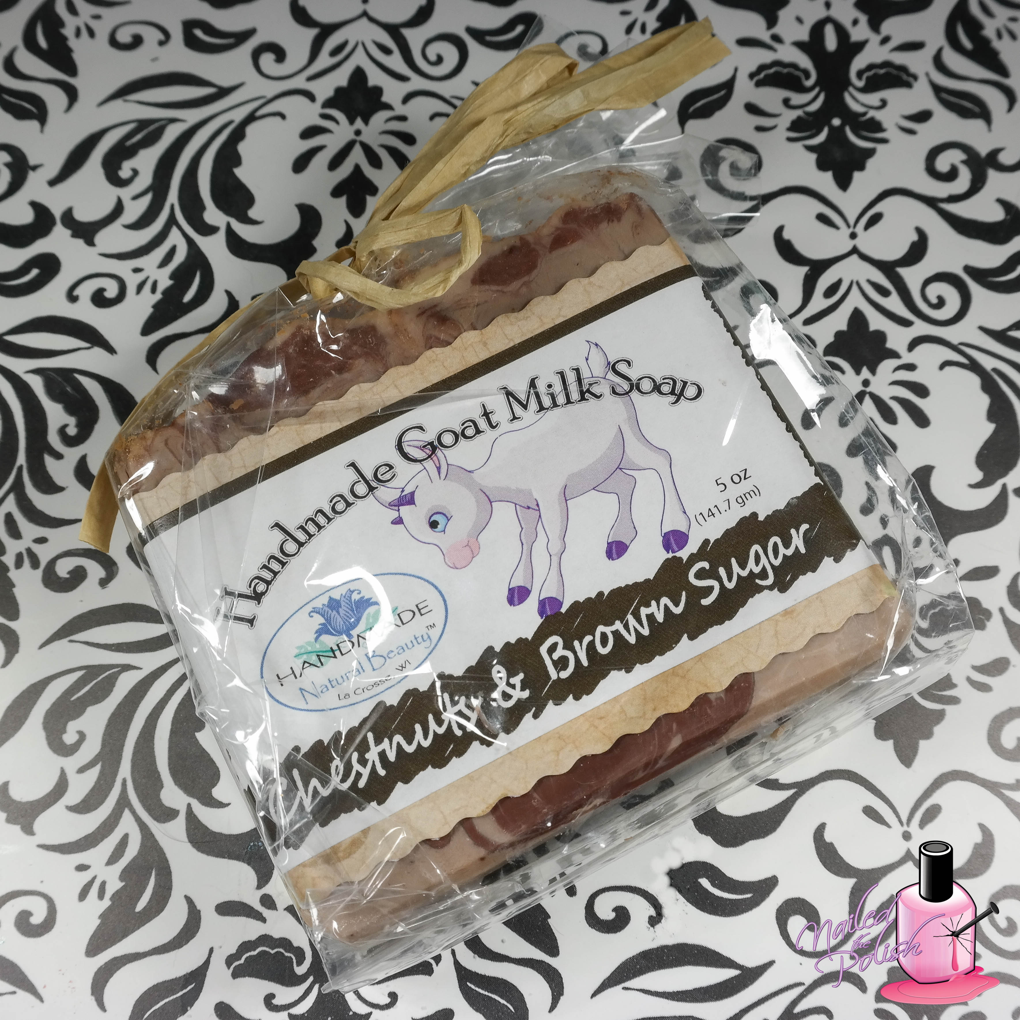 Handmade Natural Beauty’s contribution is handmade Goat Milk soap in Chestnut & Brown Sugar. I have never heard of goat milk soap before so this was really intriguing to me! As per the note on their package, “Our Goat Milk Soaps are wonderfully creamy and moisturizing. Those who have sensitive skin or eczema, may find goats milk soap to be ideal to gently cleanse, soothe, and moisturize.”