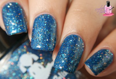 Winter Solstice by Dollish Polish is a blue jelly base with blue and copper glitters and added shimmer. Shown here is three coats plus top coat. This polish is really easy to apply and control. The glitter to base ratio is practically perfect! You don’t have to fish for any of the glitters and they distribute very well across the nail. I love the added shimmer and glitter contrast of this polish!