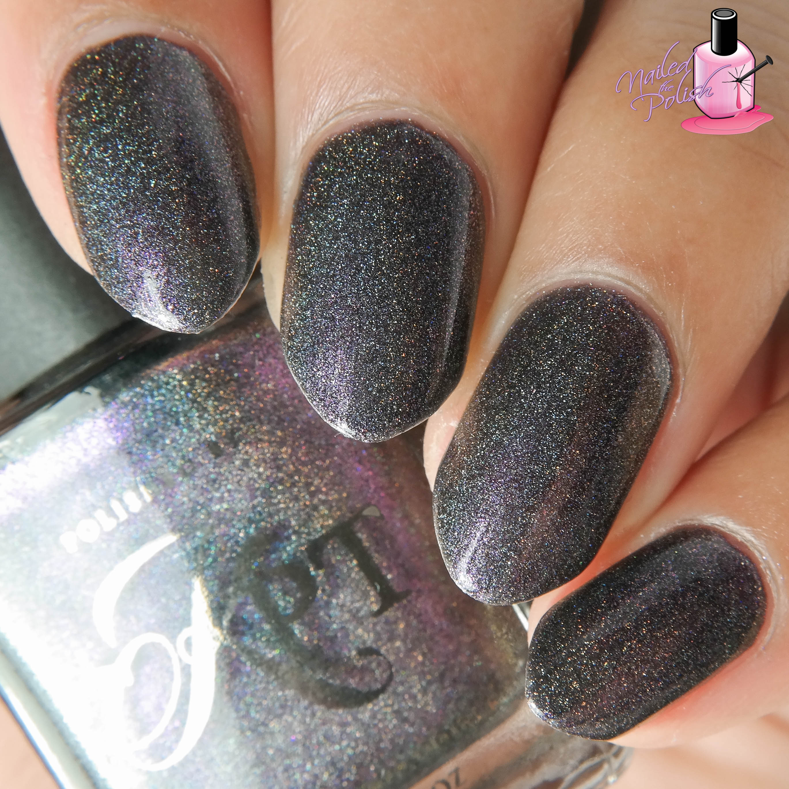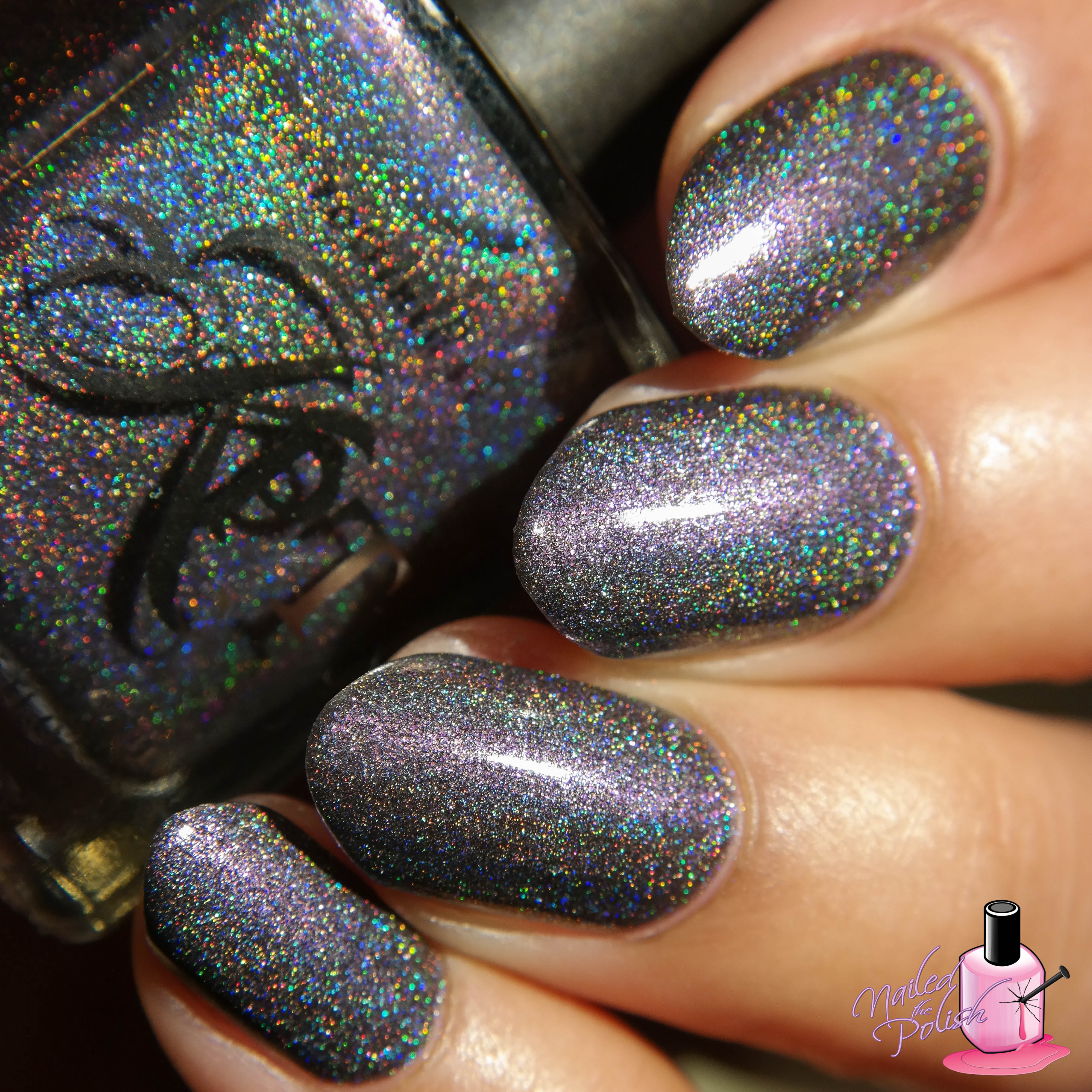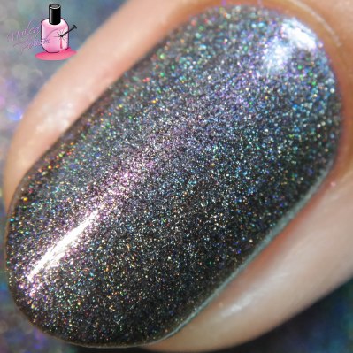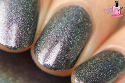 Last up is Date Night – a black holographic polish filled with a multitude of blue, violet, purple, olive, and gold color shifting micro shimmers. Shown here is two coats plus top coat. This polish is absolutely perfect! The formula is exceptional and the black holo base with color shifting micro shimmers is to die for! This is one of those polishes that looks different depending on the lighting it is under. So, so magical!