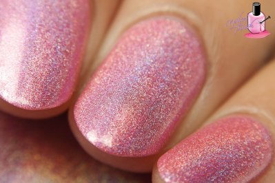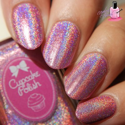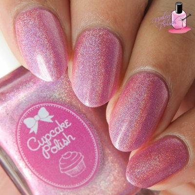 First up is First Kiss – a very light pink super crazy linear holo with subtle metallic gold shimmer. Shown here is two coats plus top coat. Per usual, the formula on this Cupcake Polish is outstanding! Super buttery, super smooth, super easy to control! As far as the shade goes, I’m in love! Such a pretty pink hue and there’s just soooo much holo!