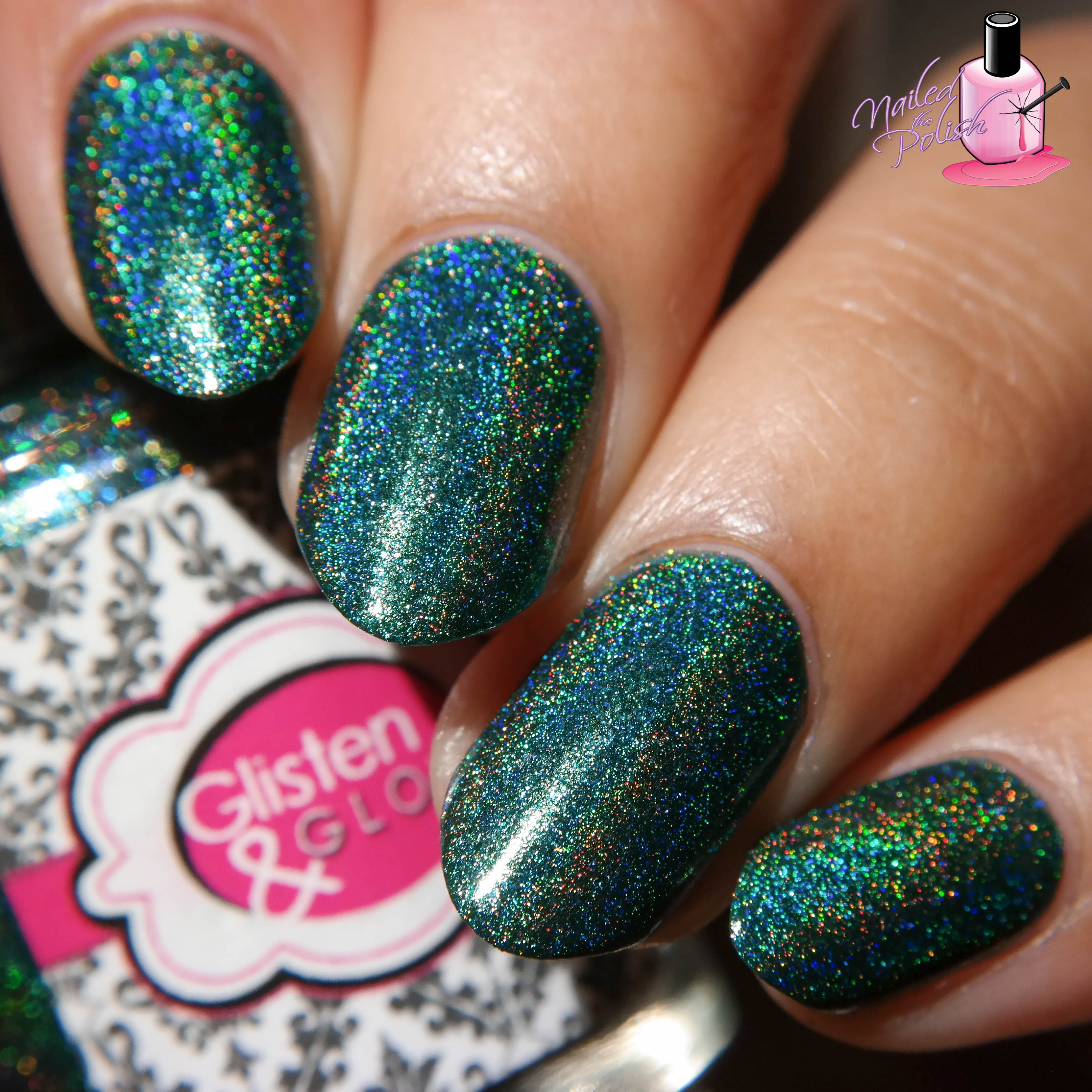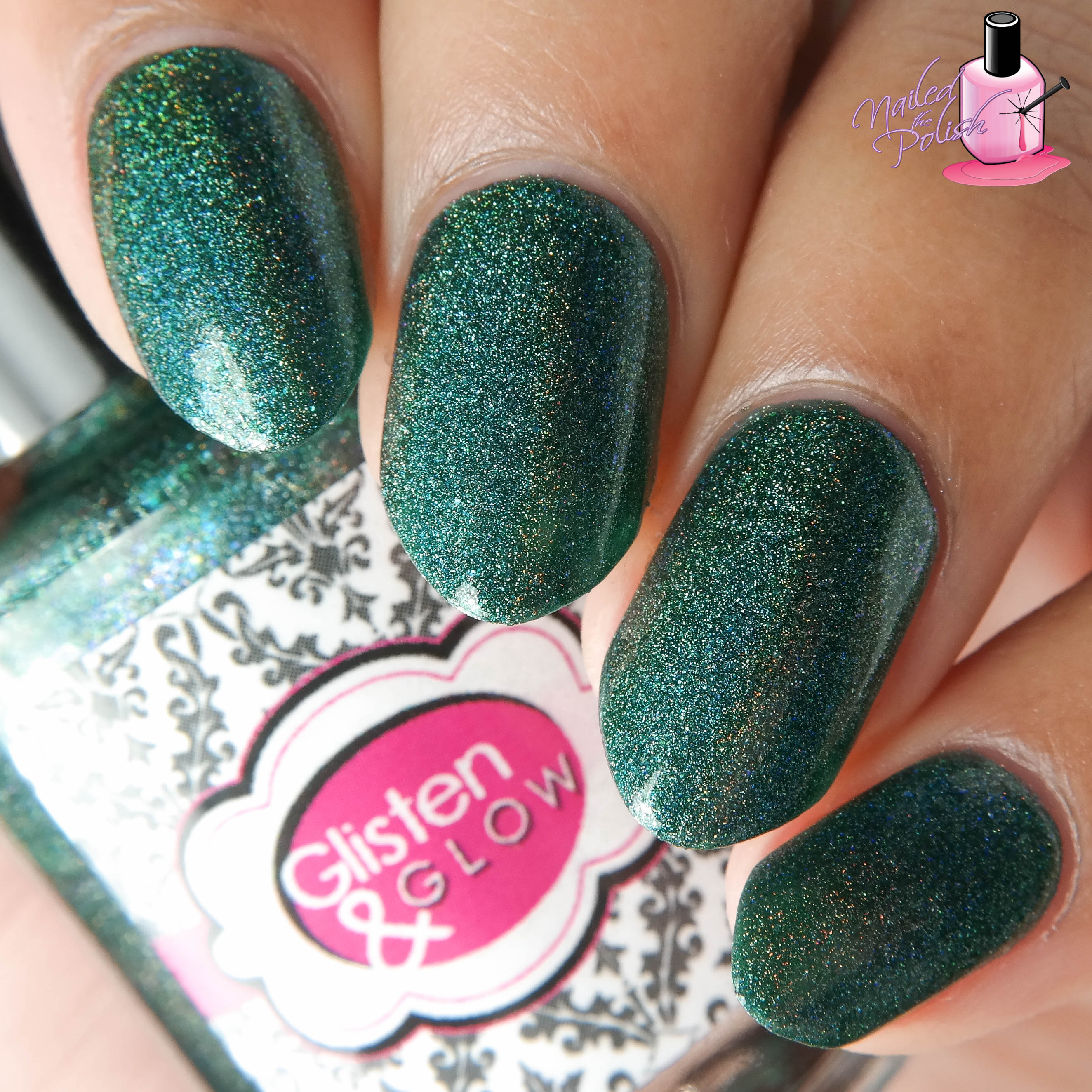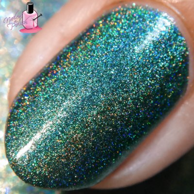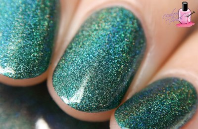 Walks In Nature is a deep emerald green linear holo with blue undertones and added purple, blue, and gold flakies. Shown here is two coats plus top coat. Such a wonderful formula! Great second coat coverage! I love the green hue of this polish – it gives it such a forresty feel. The flakies are an amazing addition to this already amazing polish!
