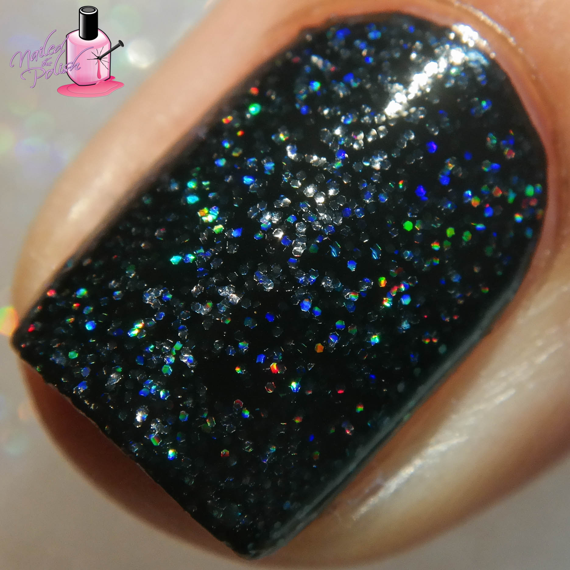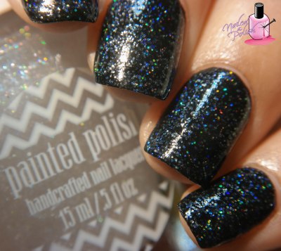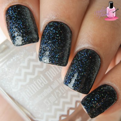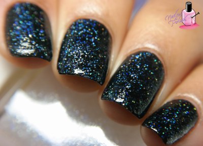 Shown here is one coat over one coat of Painted Polish Midnight Mischief (best black EVER!) plus top coat. The glitter to base ratio is absolutely perfect – as with all other PP micro glitters. Usually glitters like these like to move around and pool at the edges but I did not experience that with this polish. It is very easy to apply and control plus it levels great!