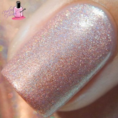 Athena is a rose gold toned nude linear holo with added metallic gold shimmer and iridescent micro flakes that shift from gold to green. Shown here is two coats NO top coat. Formula is perfection! I absolutely love the delicacy of the nude rose gold yet powerful bang of the holo and metallic shimmer! So stunning!