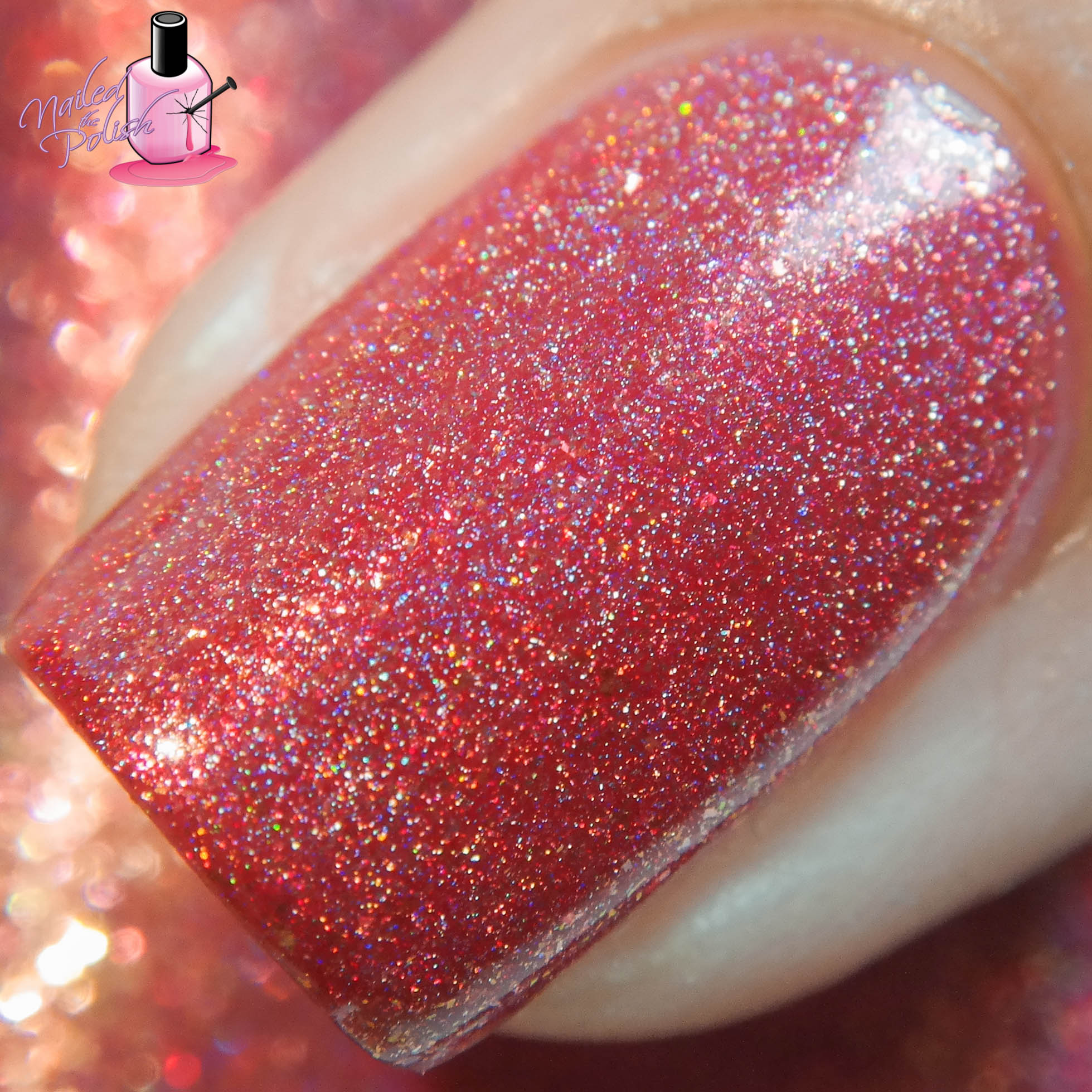 Aphrodite is a warm toned slightly orange leaning red jelly holo with fuchsia and copper flakes. Shown here is two coats NO top coat. Amazing formula! Great consistency, wonderful application, and dries and levels very well. If you’ve been following my blog for a bit, you’ll know that I’m not a huge fan of red polishes. This one, however, is one that I adore and can actually see myself wearing! I don’t know what it is about it – I just know that it’s fantastic!
