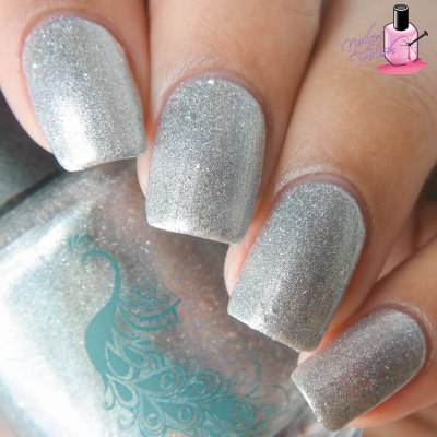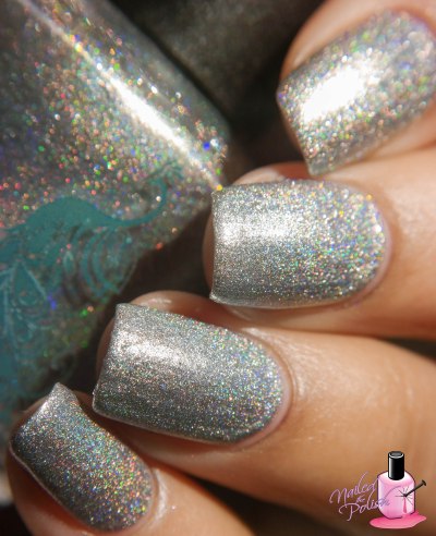 Bite my Shiny Metal A$$! is chrome metallic ultra holo with flakies and is of course named after Bender and his favorite catch phrase. Shown here is two coats plus top coat. This polish also finishes with light visible brush strokes but I could care less because this polish is amazing! The ultra holo with metallic chrome finish and added flakies are basically perfection!