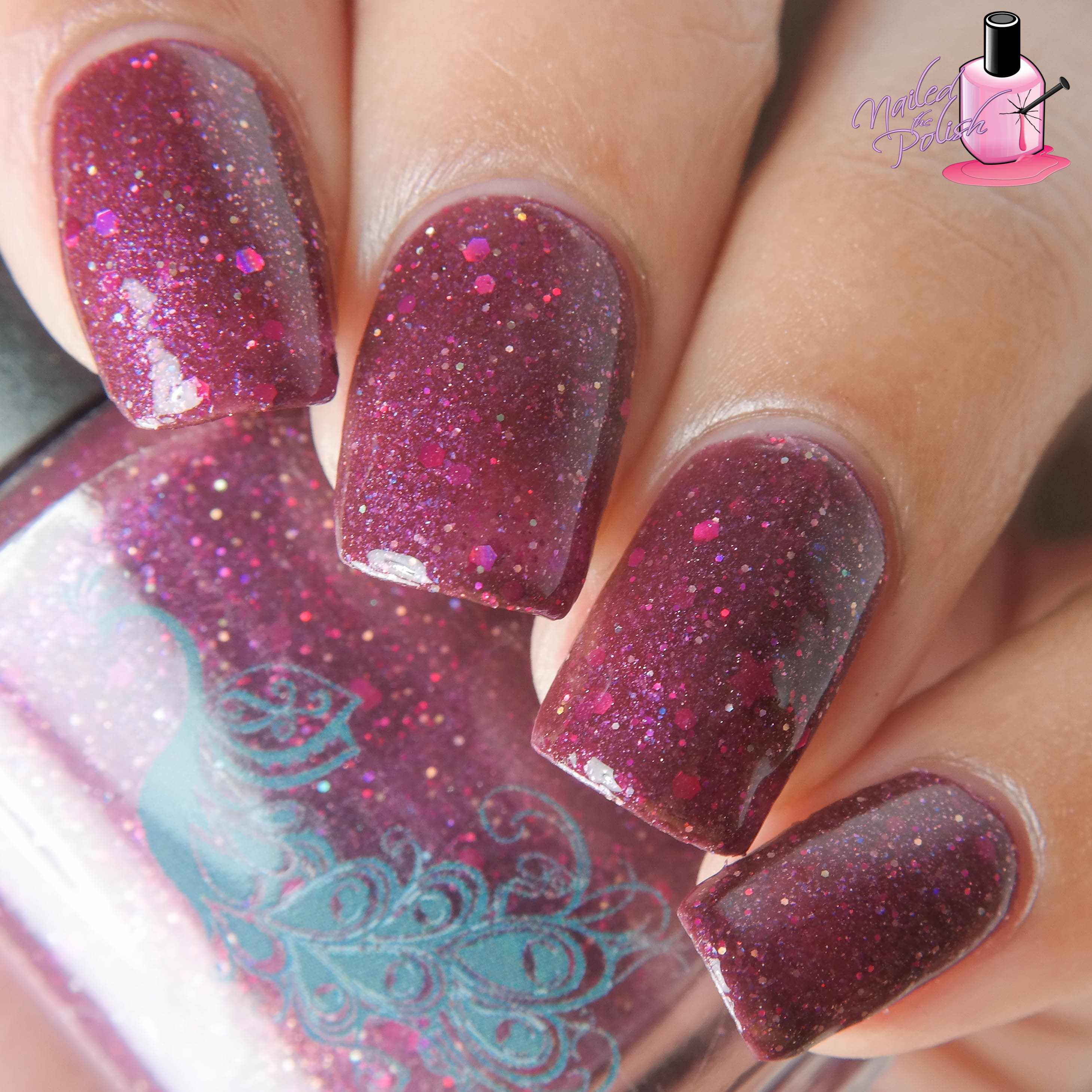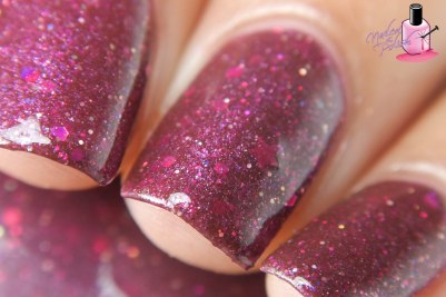 Shpluh! is a pink to magenta thermal with shimmers and holo magenta glitters of various shapes and sizes, including hearts and stars. This polish is based off of the character Amy who wears a pink sweat suit all the time even though she is a martian heiress. Shown here is three coats plus top coat. The formula is fantastic! My only issue is that it is a bit hard to pick up the larger glitters. To help with this, purchases of this polish will include a bag of glitters for placement.