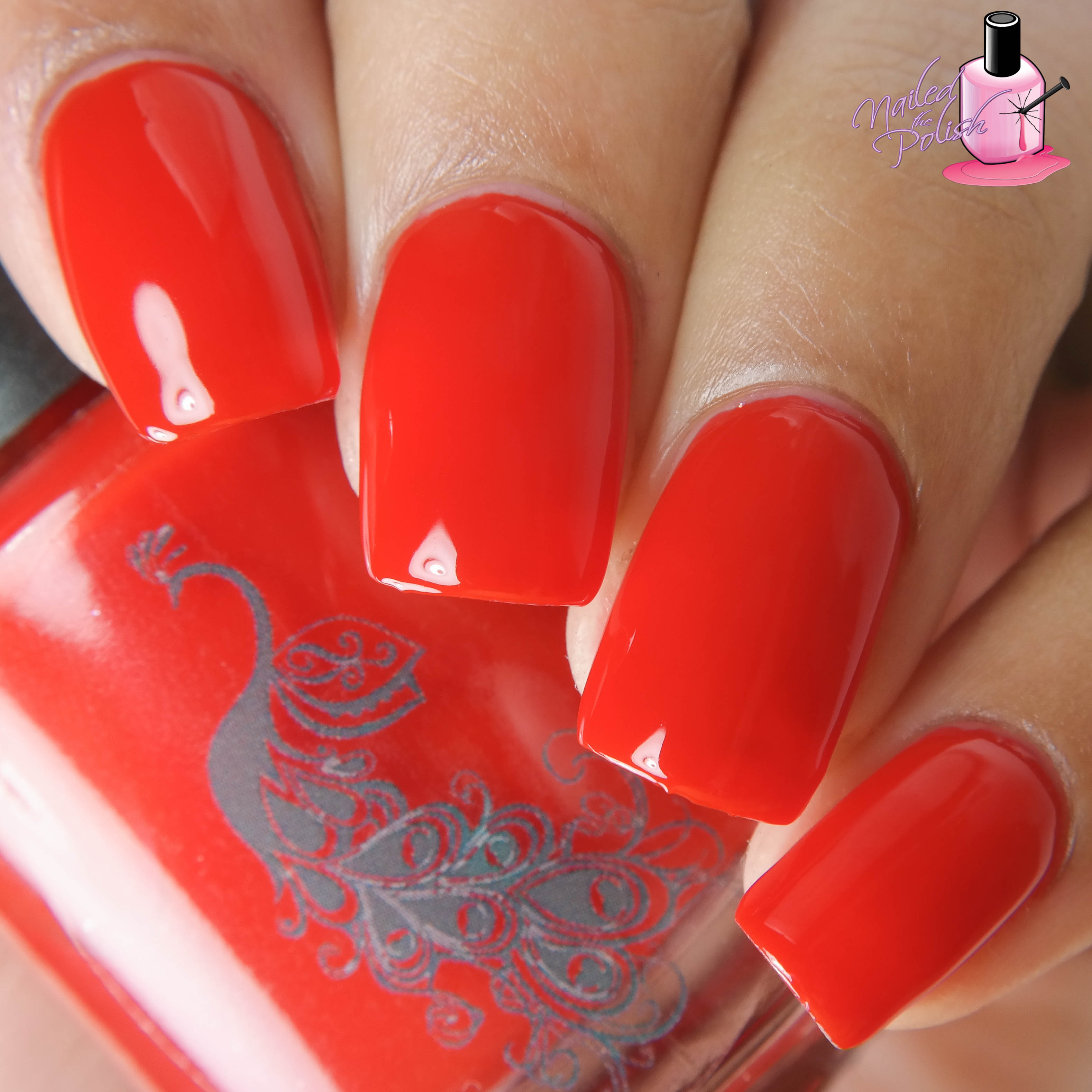 Woop, Woop, Woop is a bright persimmon red jelly inspired by Zoidberg and his signature exit phrase. Shown here is three coats plus top coat. I had a slight visible nail line after the second coat so I added a third to cover it up. Formula is really great – very easy to apply and control!