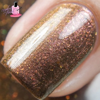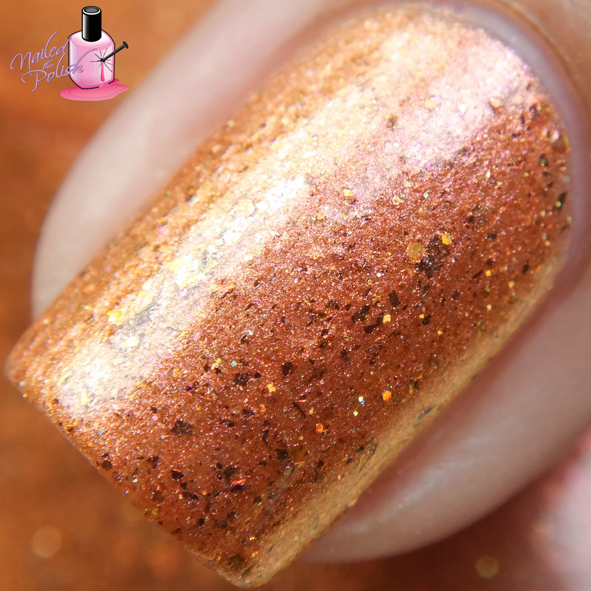 Yahoo! Y2K Topper is a coppery orange to light pink metallic duochrome with added multichrome flakes and gold micro glitter. Shown here is two coats plus top coat. This polish is meant to be a topper that you can layer over red, white, or black but I just love it so much on its own! The finish is slightly streaky but that’s expected since it’s a metallic duochrome. Besides that, I had no issues with this polish. I love how multi-dimensional it is! The orange-pink shift is stunning as are the added elements.
