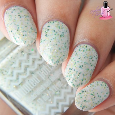 Celtic Crelly is a white crelly with added metallic green, gold, and lime green holographic glitters. Shown here is two coats plus top coat. This polish has a great formula! It’s really easy to apply and control. The consistency is wonderful as is the glitter to base ratio! This is a polish that’s great to wear on its own or as a base for some epic St. Patrick’s Day nail art! 😀