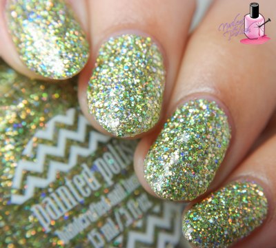Leprechaun Luck is a full coverage holographic glitter packed with gold, silver, and lime green glitters. Shown here is two coats plus top coat. I love the coverage this polish has! Two super easy brushed coats and that’s all you need! 🙂 The glitters lay flat and stay put so you don’t need to dab whatsoever. Such a pretty (and sparkly!!) glitter! ❤