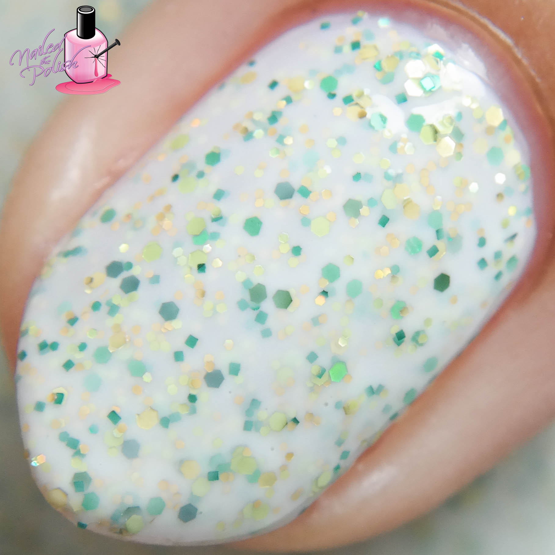 Celtic Crelly is a white crelly with added metallic green, gold, and lime green holographic glitters. Shown here is two coats plus top coat. This polish has a great formula! It’s really easy to apply and control. The consistency is wonderful as is the glitter to base ratio! This is a polish that’s great to wear on its own or as a base for some epic St. Patrick’s Day nail art! 😀