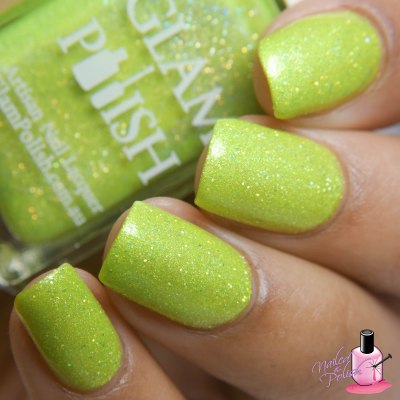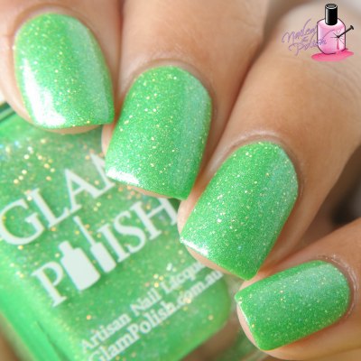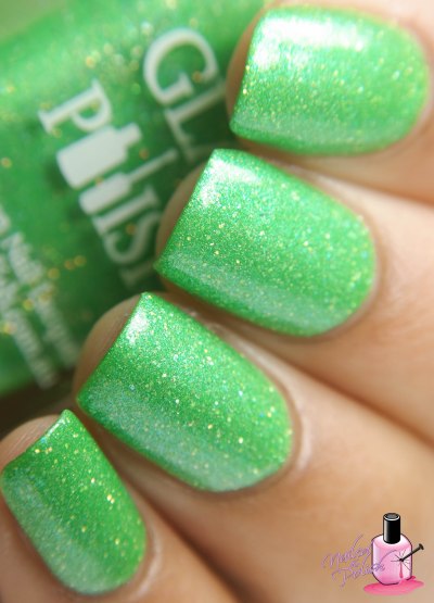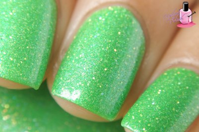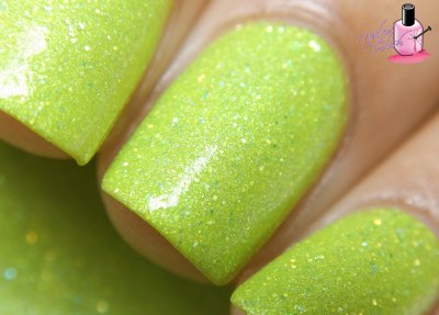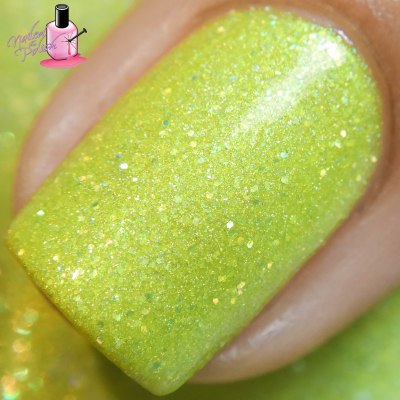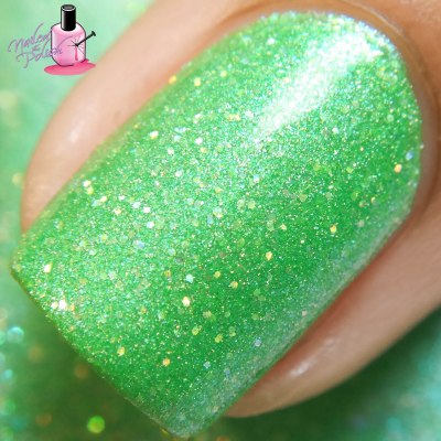 She’s Got The Power is a bright green scattered holo with blue shimmer and a sprinkling of ultra holographic glitter. Shown here is two coats plus top coat.