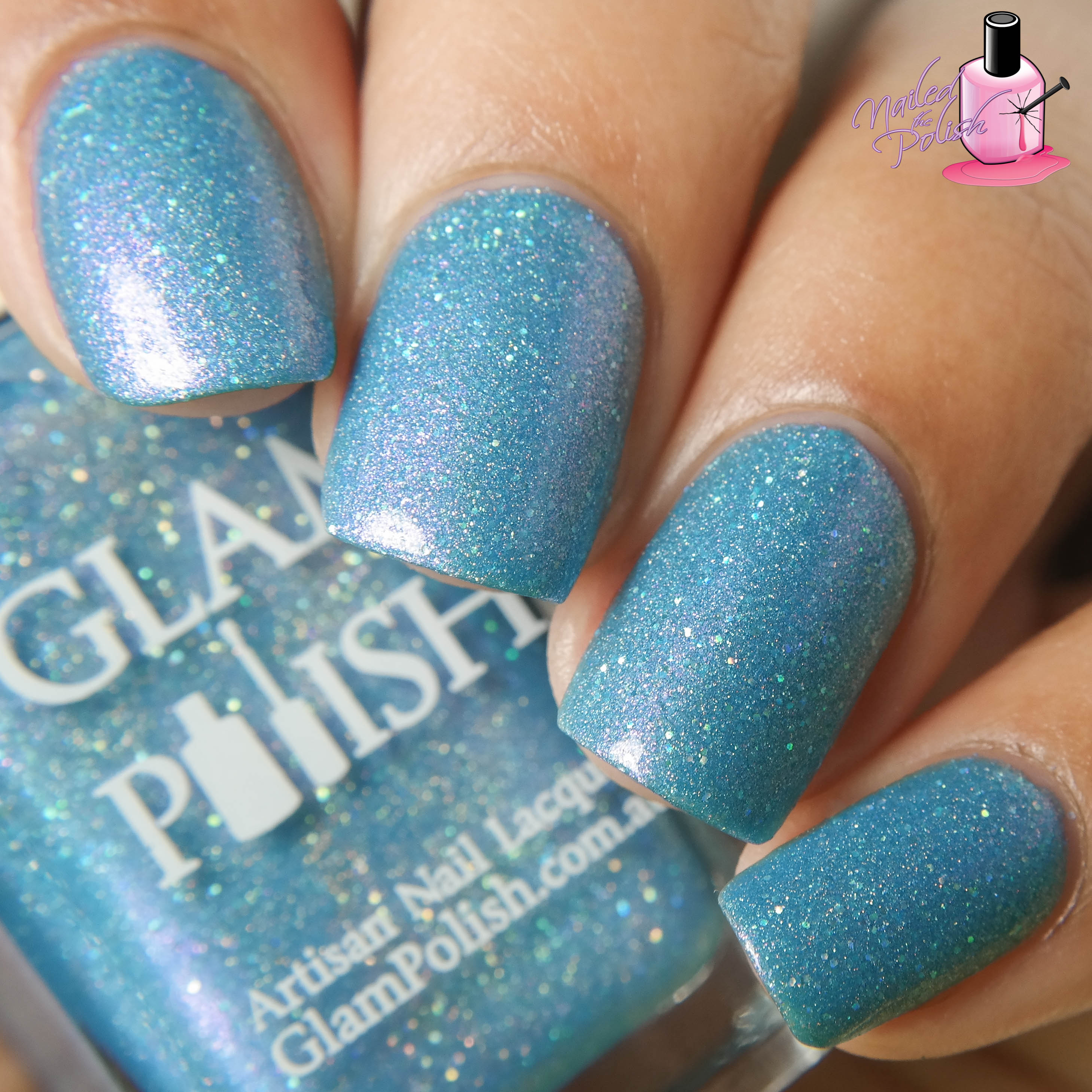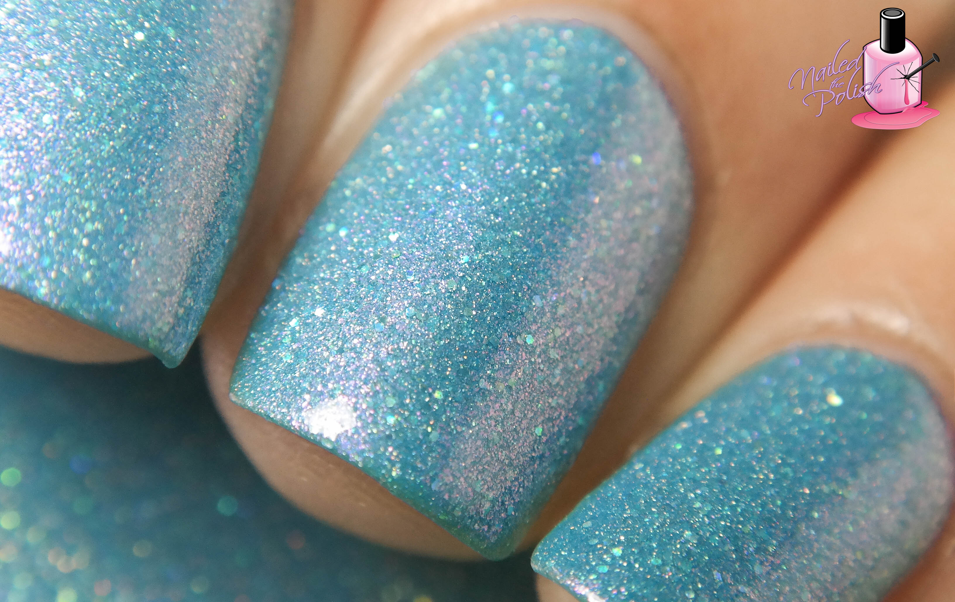 I Got My Eye On You is a beautiful bright sky blue scattered holo with fuchsia shimmer and a sprinkling of ultra holographic glitter. Shown here is two coats plus top coat.