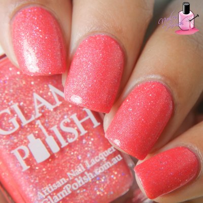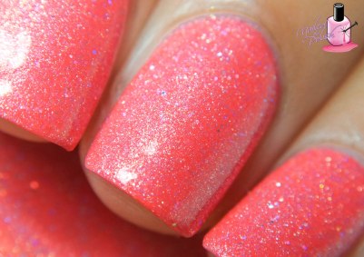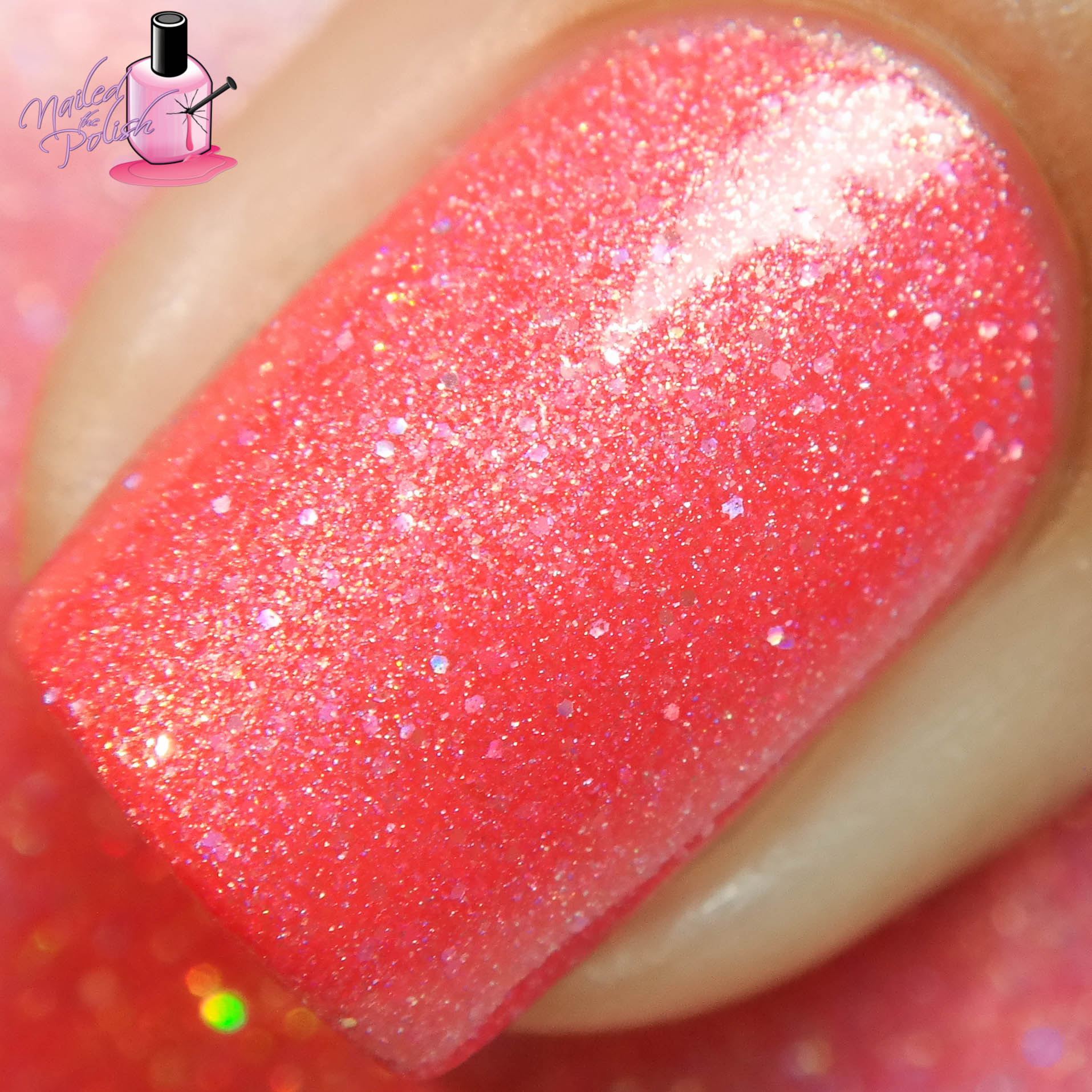 Starlight Music is a bright Watermelon scattered holo with gold shimmer and a sprinkling of ultra holographic glitter. Shown here is ONE coat plus top coat.