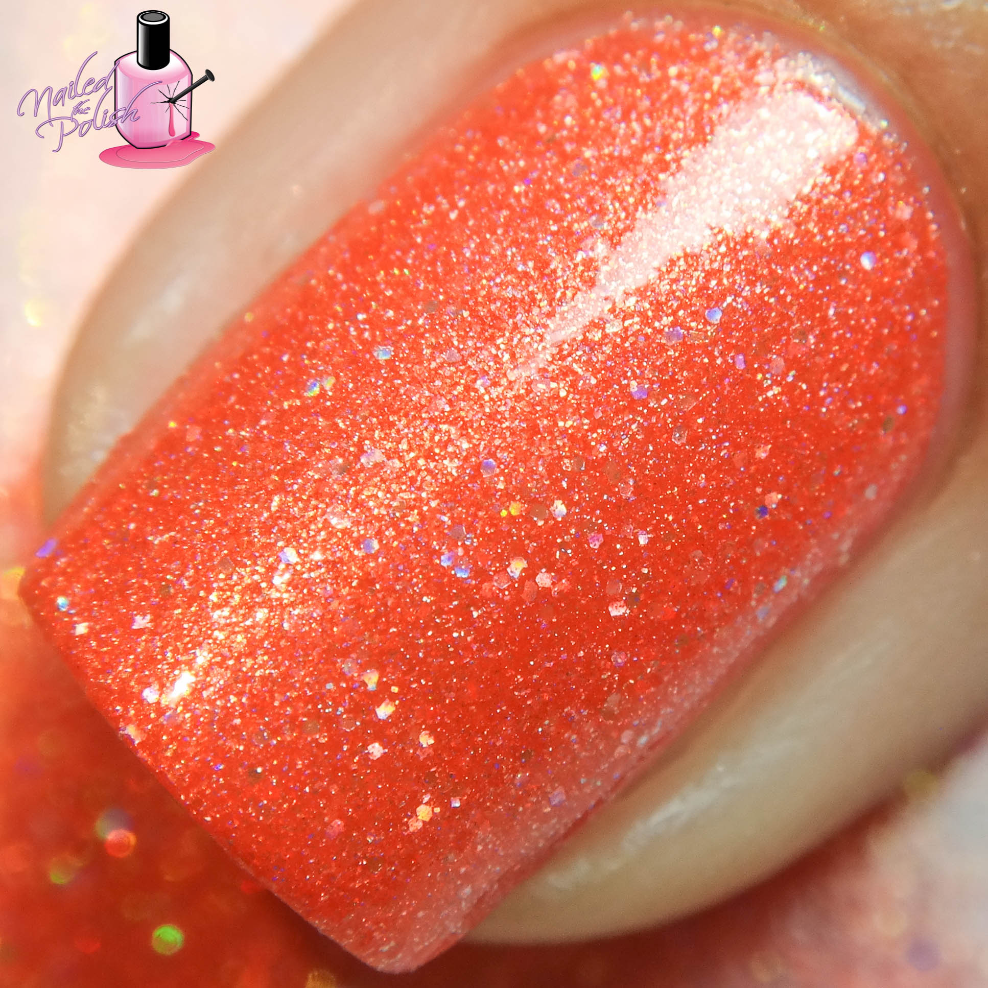 Without Us, You’re Nothing is a bright Orange scattered holo with gold shimmer and a sprinkling of ultra holographic glitter. Shown here is ONE coat plus top coat.