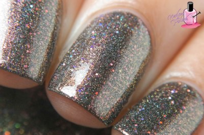 Superhero Landing! is a black linear holo with red/copper shimmers and red holo glitters. Shown here is two coats plus top coat. This polish gives me life and I swear I would wear it every day! The holo, the shimmers, the micro glitters – you NEED this polish!