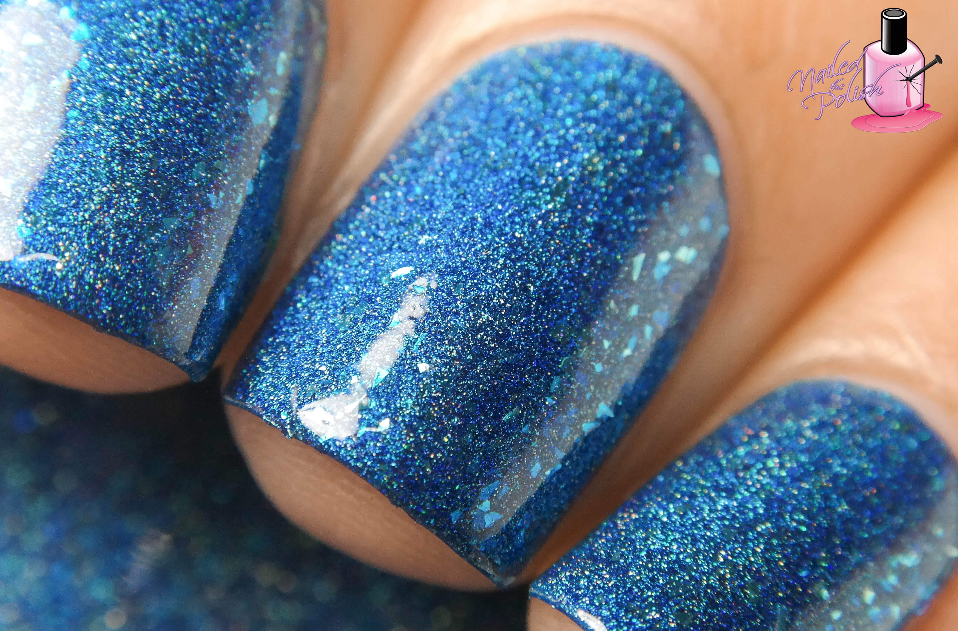 Shake N Bake is a royal blue linear holo with shiny silver flakies. Shown here is two coats plus top coat. Formula is absolutely fantastic! It was opaque in one coat but I added a second to deepen the royal blue base. I am so in love with this polish! The royal blue holo base plus silver flakies mixed in is perfection ❤