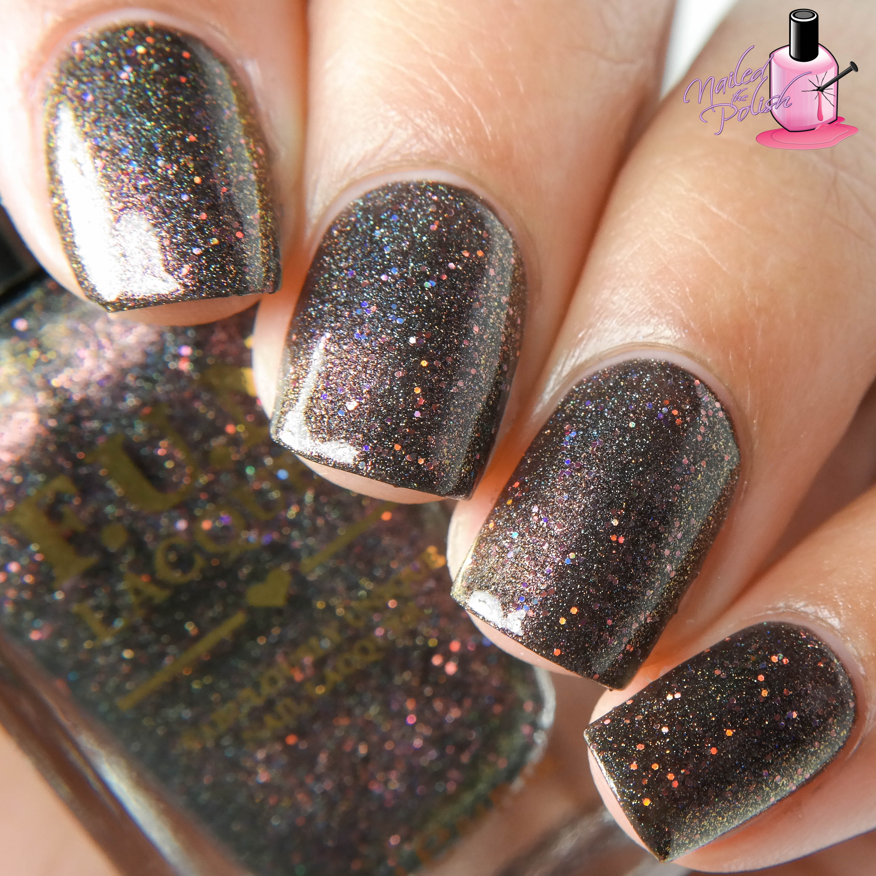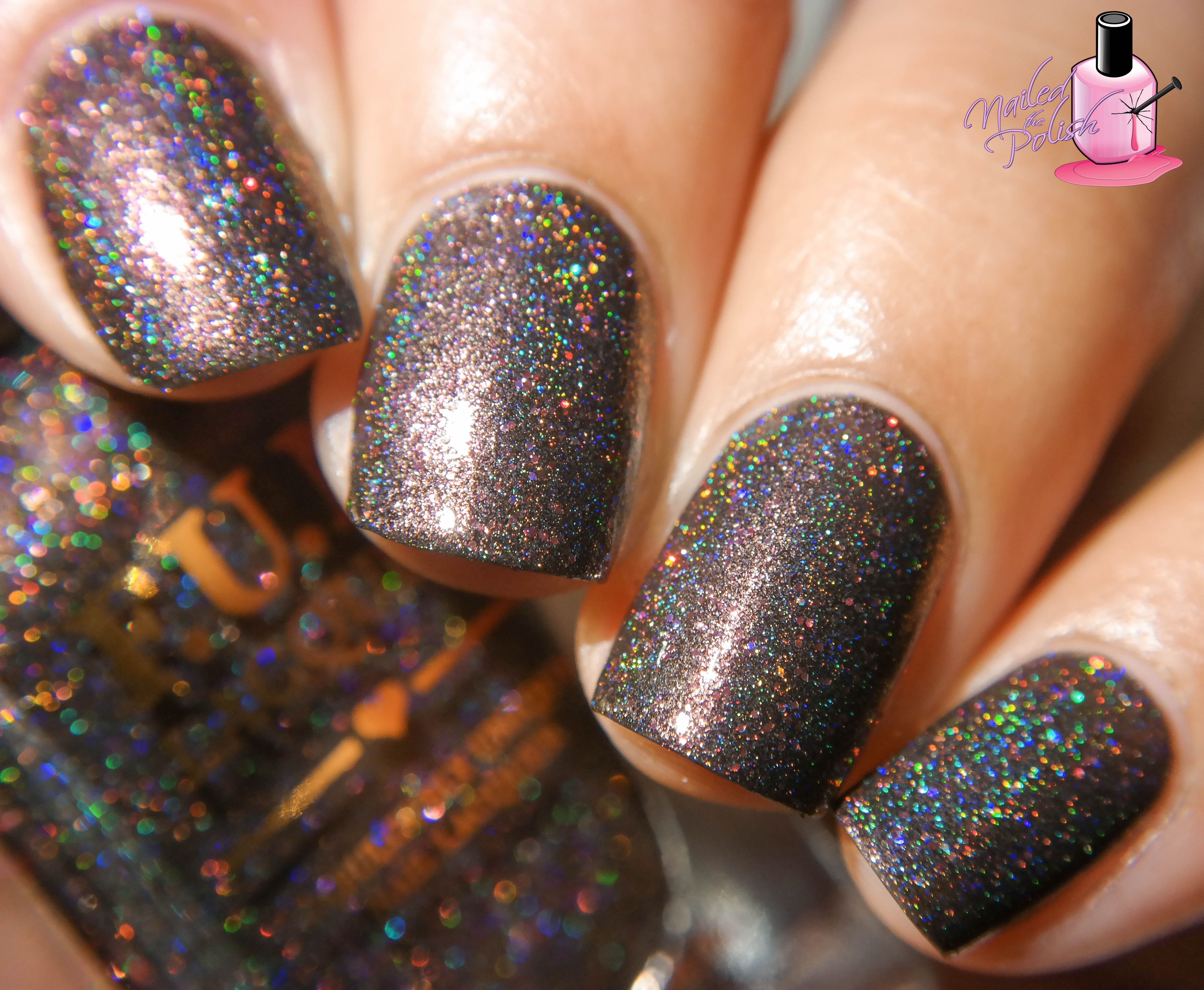 Superhero Landing! is a black linear holo with red/copper shimmers and red holo glitters. Shown here is two coats plus top coat. This polish gives me life and I swear I would wear it every day! The holo, the shimmers, the micro glitters – you NEED this polish!