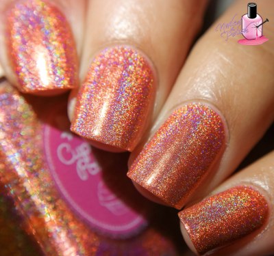 Cocoon is a beautiful coral leaning orange linear holo. Shown here is two coats plus top coat. Of all six polishes, this is surprisingly my favorite!
